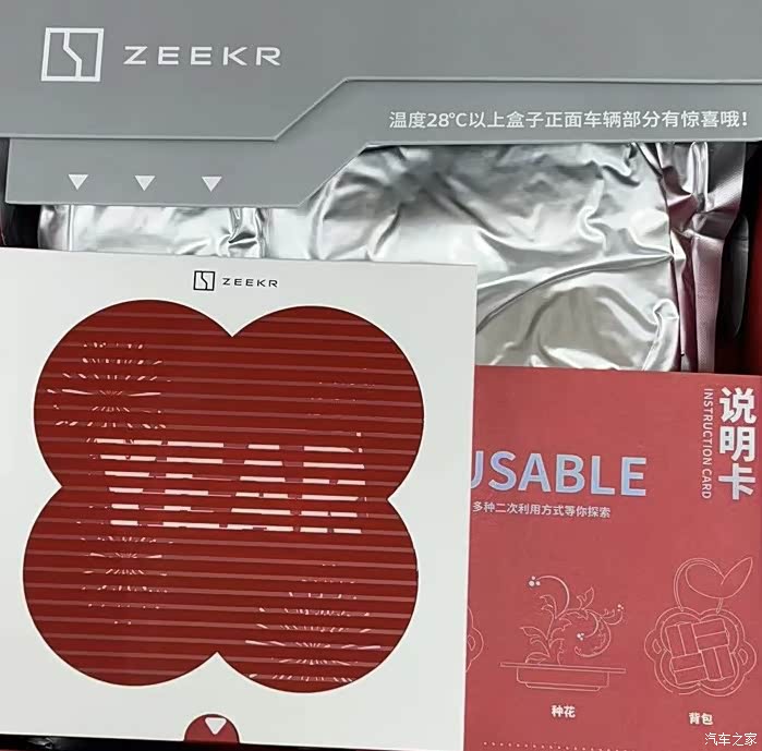 这个包装可不仅仅是好看那么简单,环保可降解,更多拓展的使用方式也贴合极氪作为新能源车企肩负环保理念的企业形象,真的是很用心的策划与设计。打开中国结礼盒,2023的新年贺卡以格栅画形式出现,别致精巧。礼盒还设计了温度变色彩蛋,呼应了礼物毛毯给我们带来的温暖,真空包装的毛毯,在这个注重卫生健康的特殊时期又被极氪将这个小细节拿捏了,极氪真的很懂用户呢!