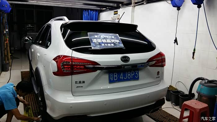 老花说差不多两个来小时做完,那好,先去附近转转吃点饭。与老花作别,过了两小时转回来,还在抛光,一问师傅,说要到晚上九点才能弄好。好你个老花,上你当了,那今晚还走个屁。看师傅做的那么细心,听师傅说是在做镀晶(当时说的是送镀膜),好吧,只有等了,赶快就近找了个地住了下来。9点过来,车子完工了,真亮,这时才想起照相。师傅说这两天最好别淋雨,不然影响效果,让我车晚上最好就停他店里(外面正在下小雨),一问明天几点开门,8点半后。太晚了,不管了,直接开出来停在了店前面的一个雨棚下,勉强保证不淋雨吧,要风大点也没办法。