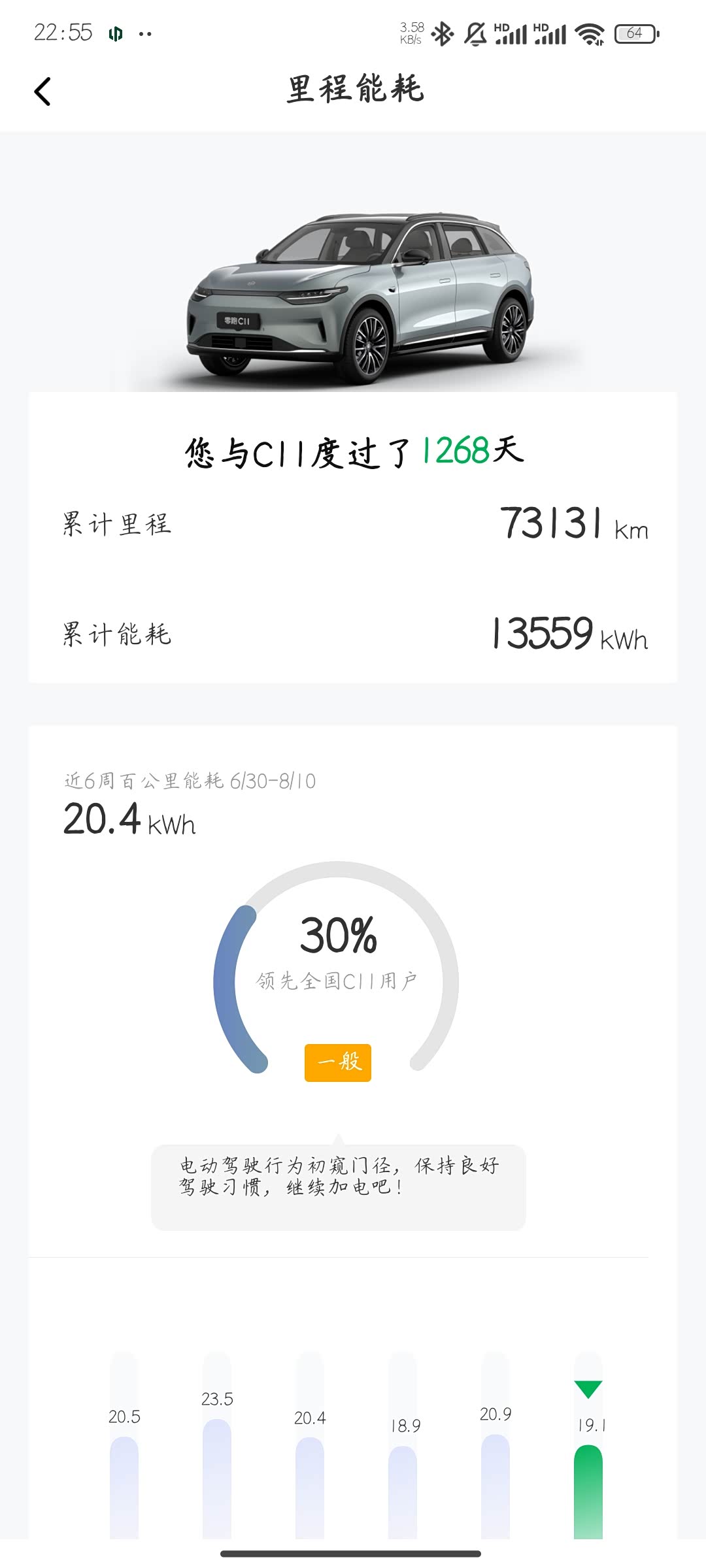 充电心得:开通家用谷峰电后,利用谷充电优惠,一般是晚上十点至次日八点。今日电耗分享