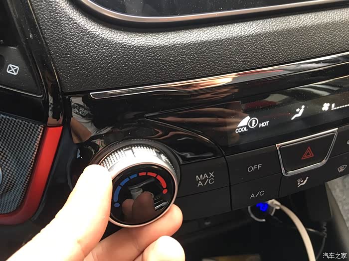 这个旋钮是控制出风温度的,往左是冷风,往右是暖风