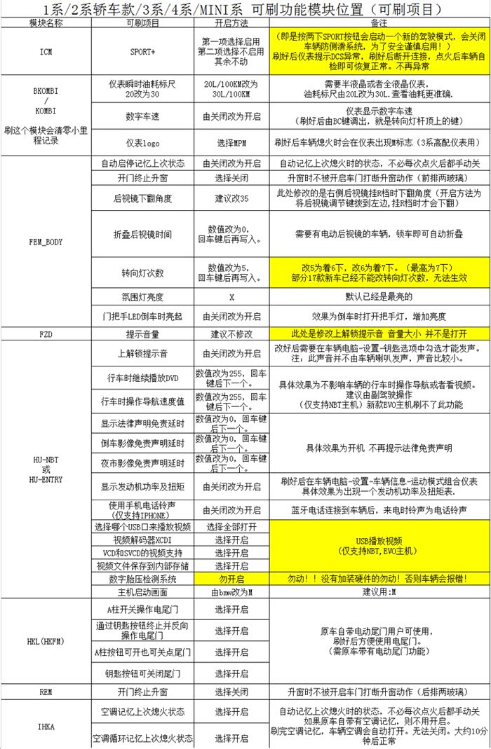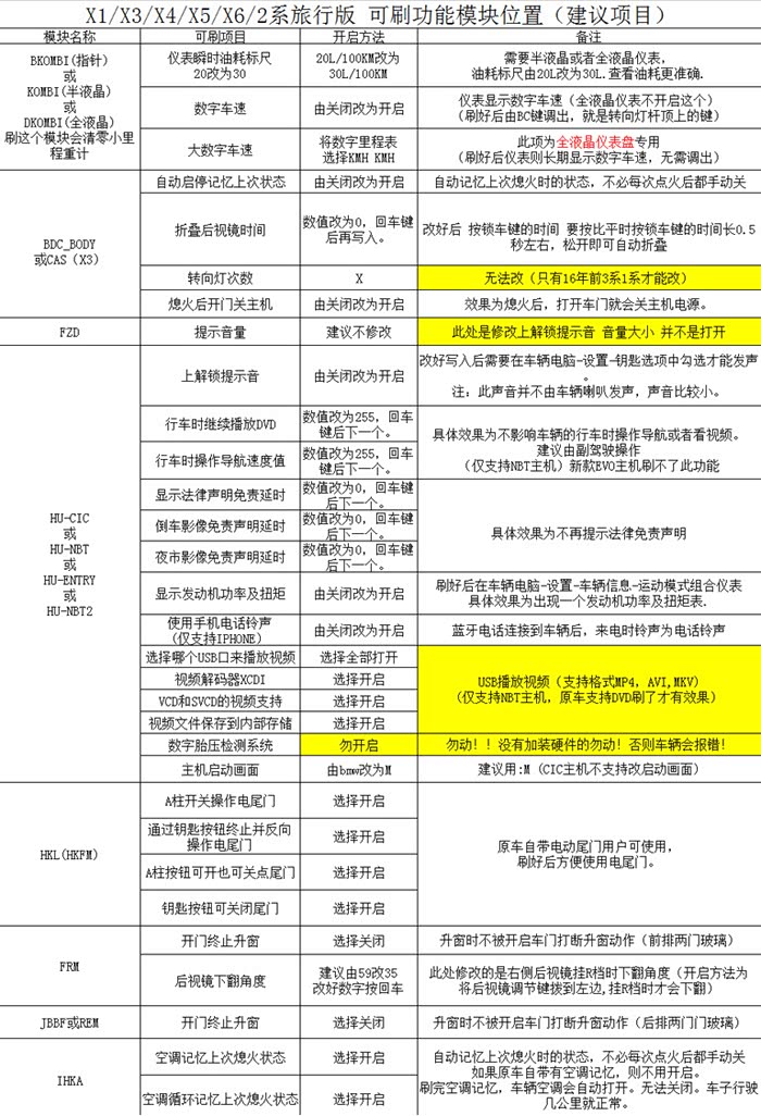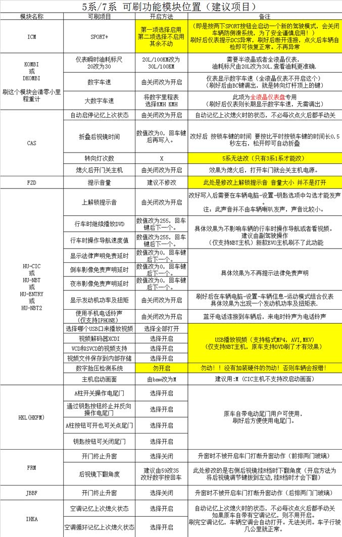 4、这个是5,7系(123MINI系、X系2系旅行版在最后)可刷隐藏部分所在模块,并建议如何设置参数。其他车系请作为参考,功能所在模块名字大同小异,按着参考来查找,如有查找不到的功能或者模块再咨询客服。