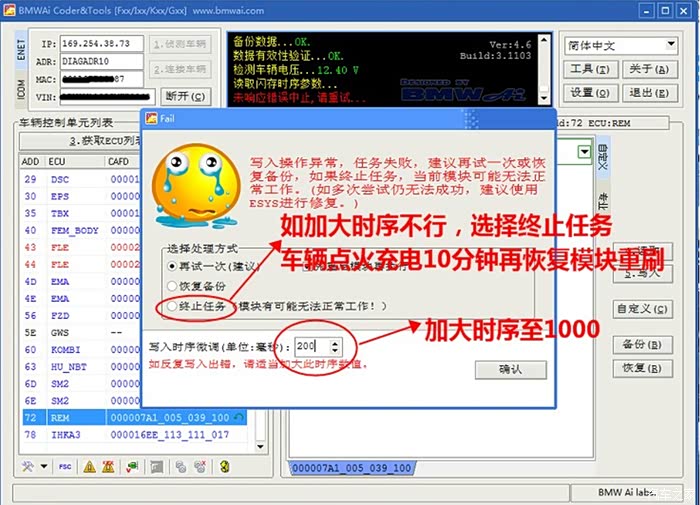 写入失败,1:先加大时序再试一次,如果还不行。2:就终止任务点火充电十分钟。恢复再刷