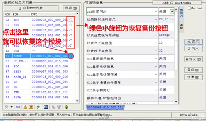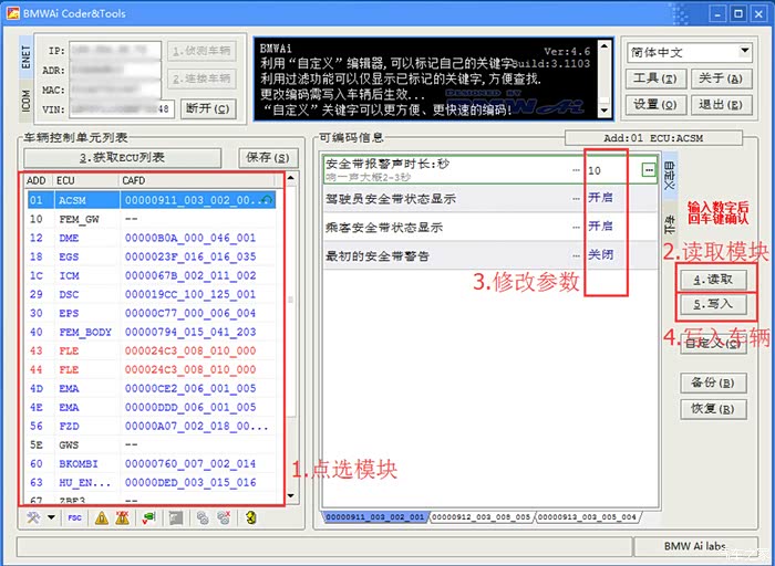 3、获取ECU列表后,点击下面的模块后点击读取,然后进行相应的参数修改,最后写入。重复此步刷不同模块。