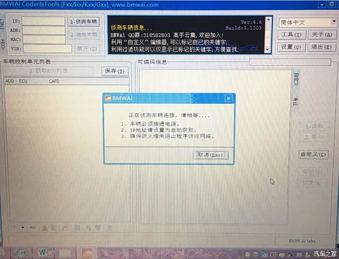 1:当出现无法侦测到车辆时(如下图),请按照软件 提示检查电脑和车的设置;