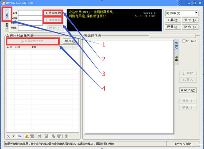 2 、左上角选择ENET,然后按图中1234的步骤,连接并读取车辆ECU列表