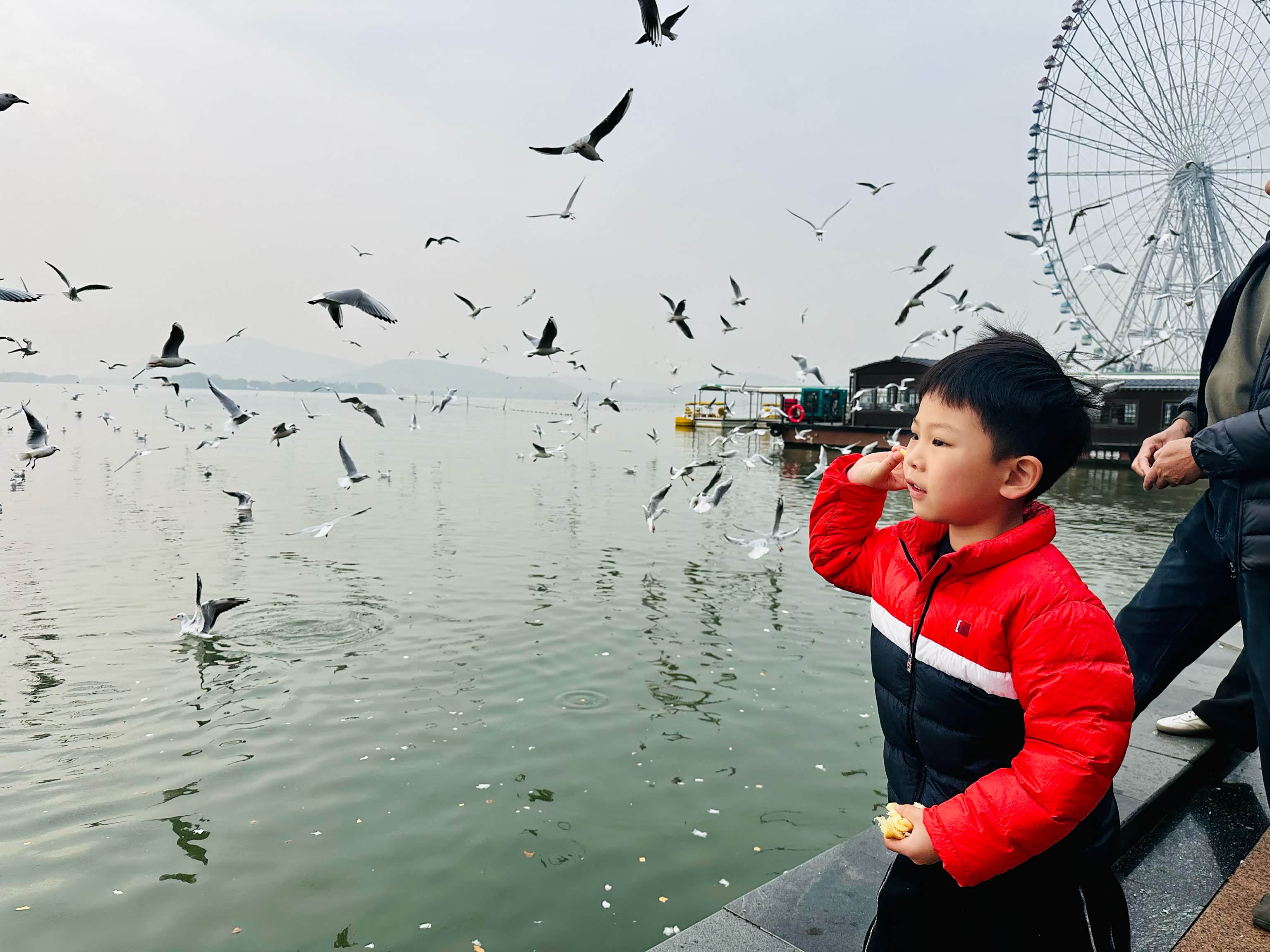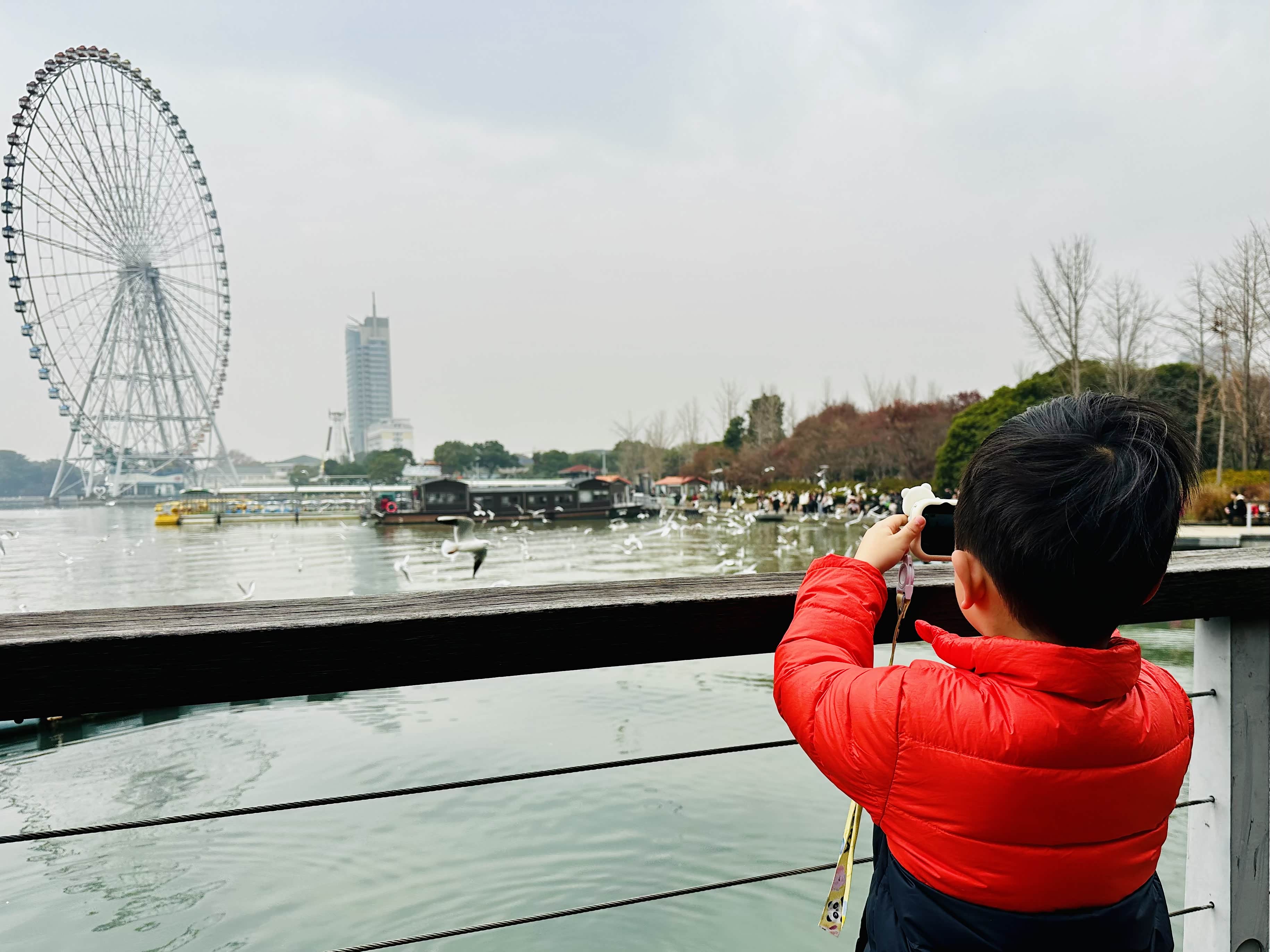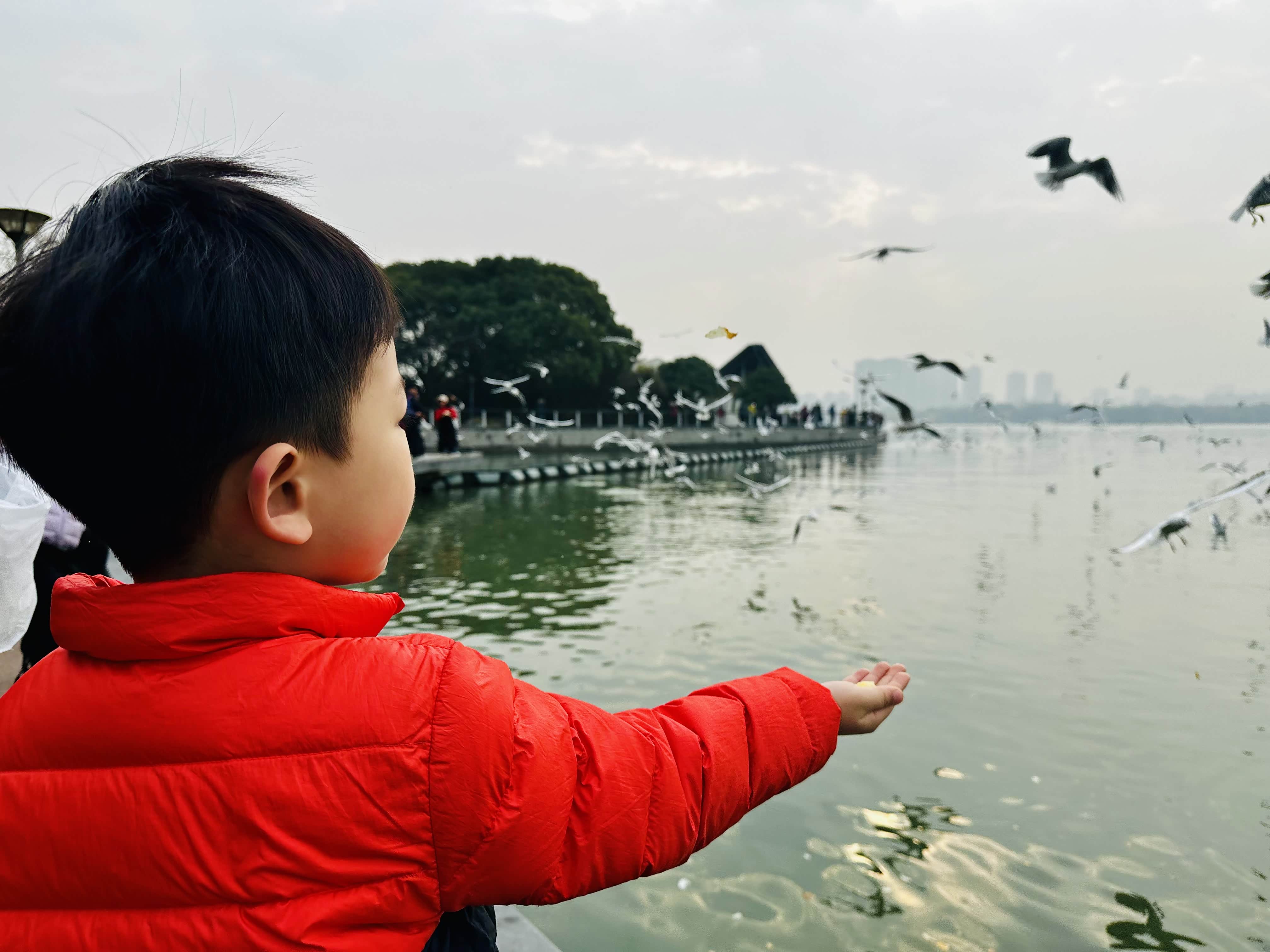 我和儿子在湖边公园一边散步一边喂鸥一边拍照。儿子也化身小小摄影师,说晚上要给妈妈看他自己拍的红嘴鸥的照片。我默默陪着他享受这难得的亲子时光,正如元plus也默默陪着我们度过每一个温馨时刻。而这就是来自江南无锡冬日的独特仪式感。来无锡旅游的小伙伴们可别忘了来蠡湖边打卡这场冬日之约呀。