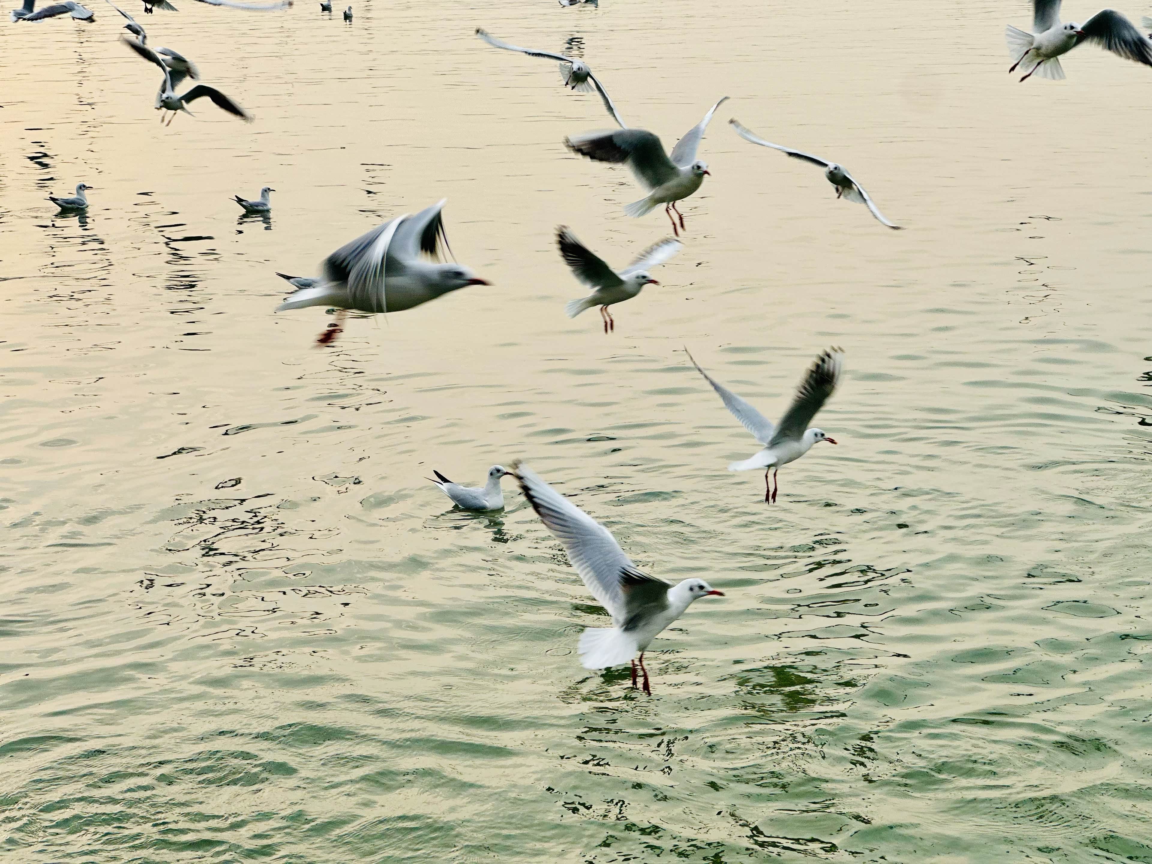 儿子早就拿着备好的面包蹦跳起来,小心翼翼地把食物抛向空中。红嘴鸥像是收到了信号,翅膀擦着他的头顶飞过精准地接住了面包。小家伙一边喊着:爸爸你丢高一点,一边手忙脚乱地继续投喂。看着他和红嘴鸥互动的模样,我举着手机不停抓拍。此刻满眼是孩子最纯粹的快乐。