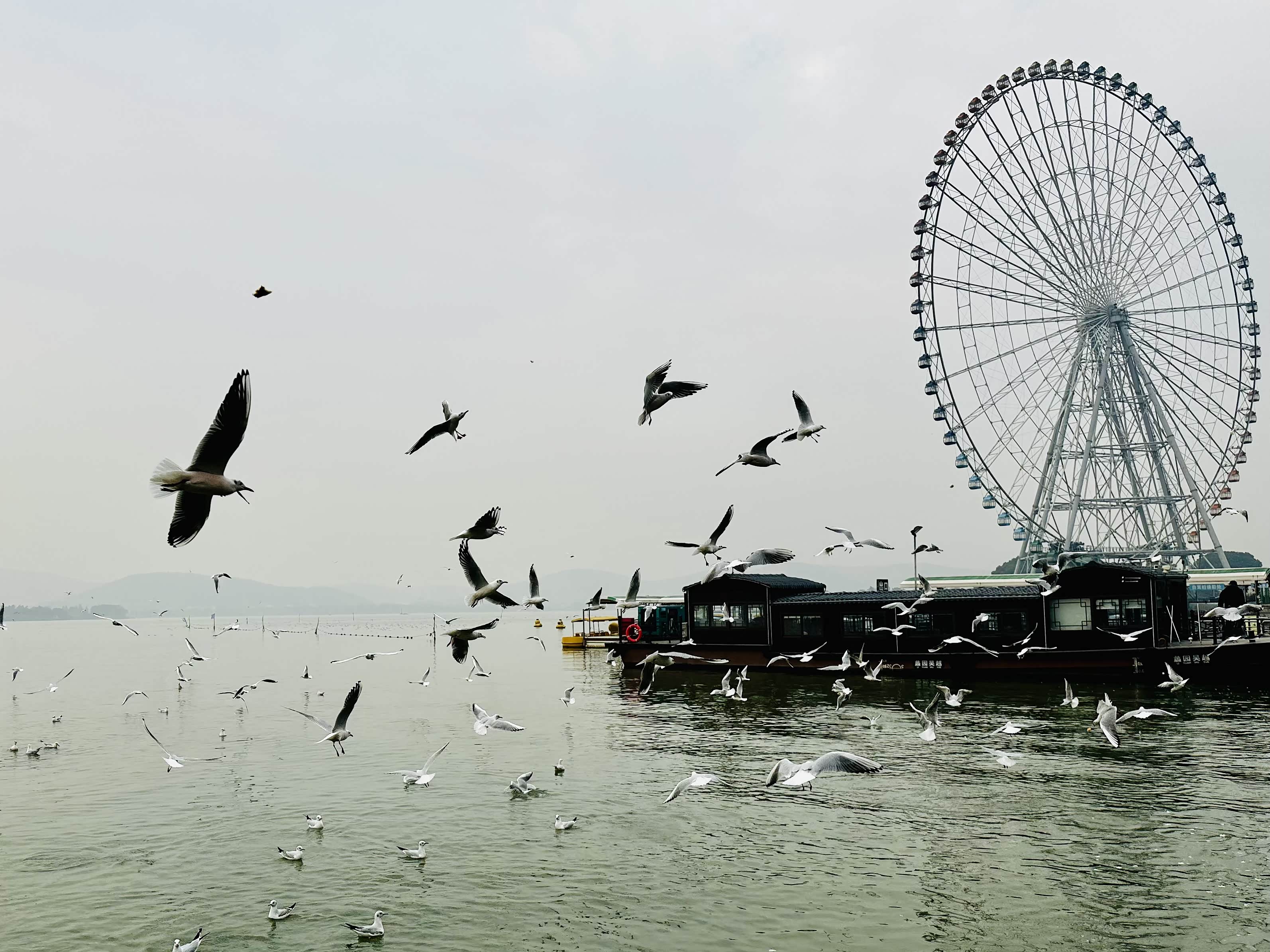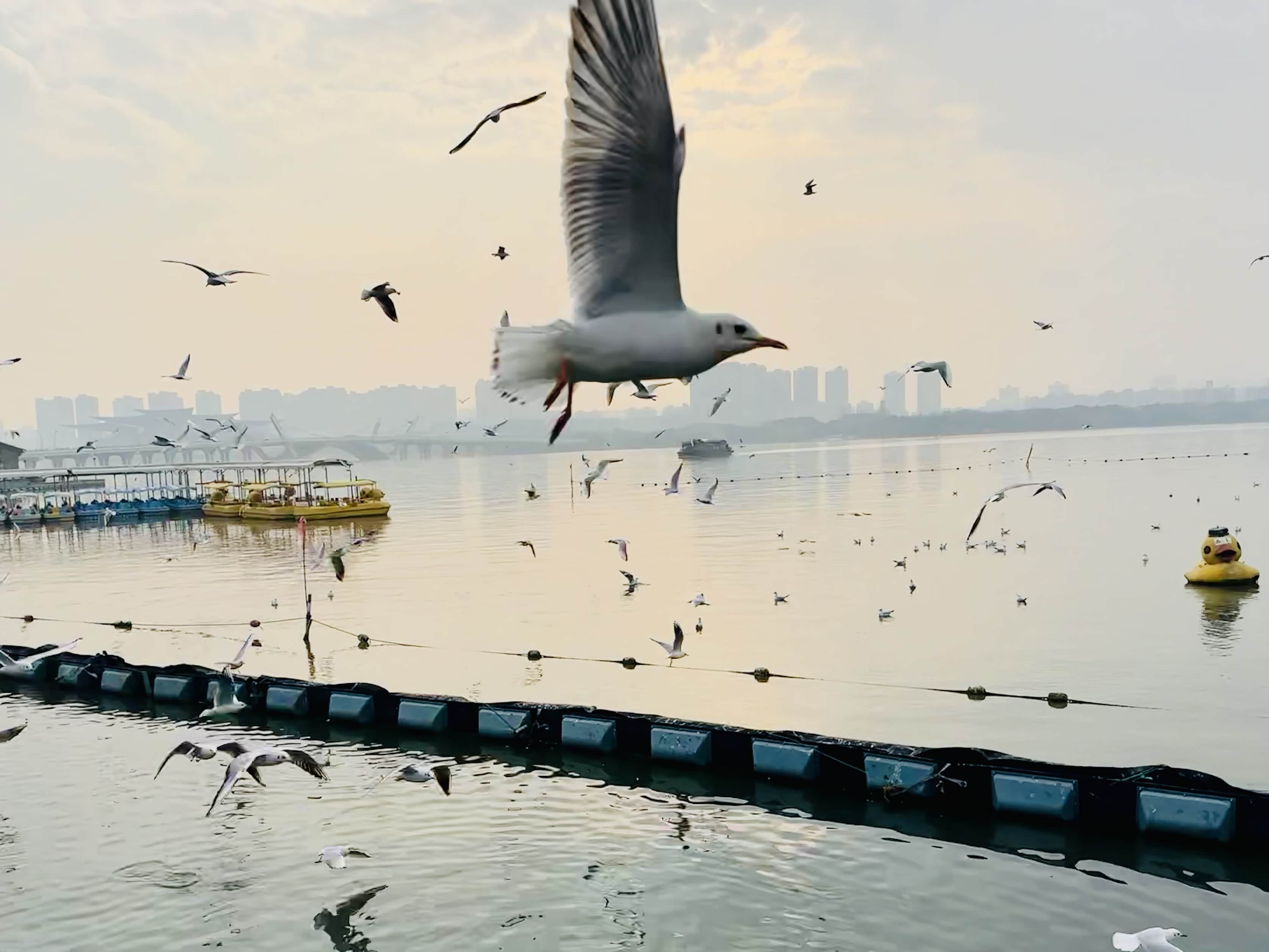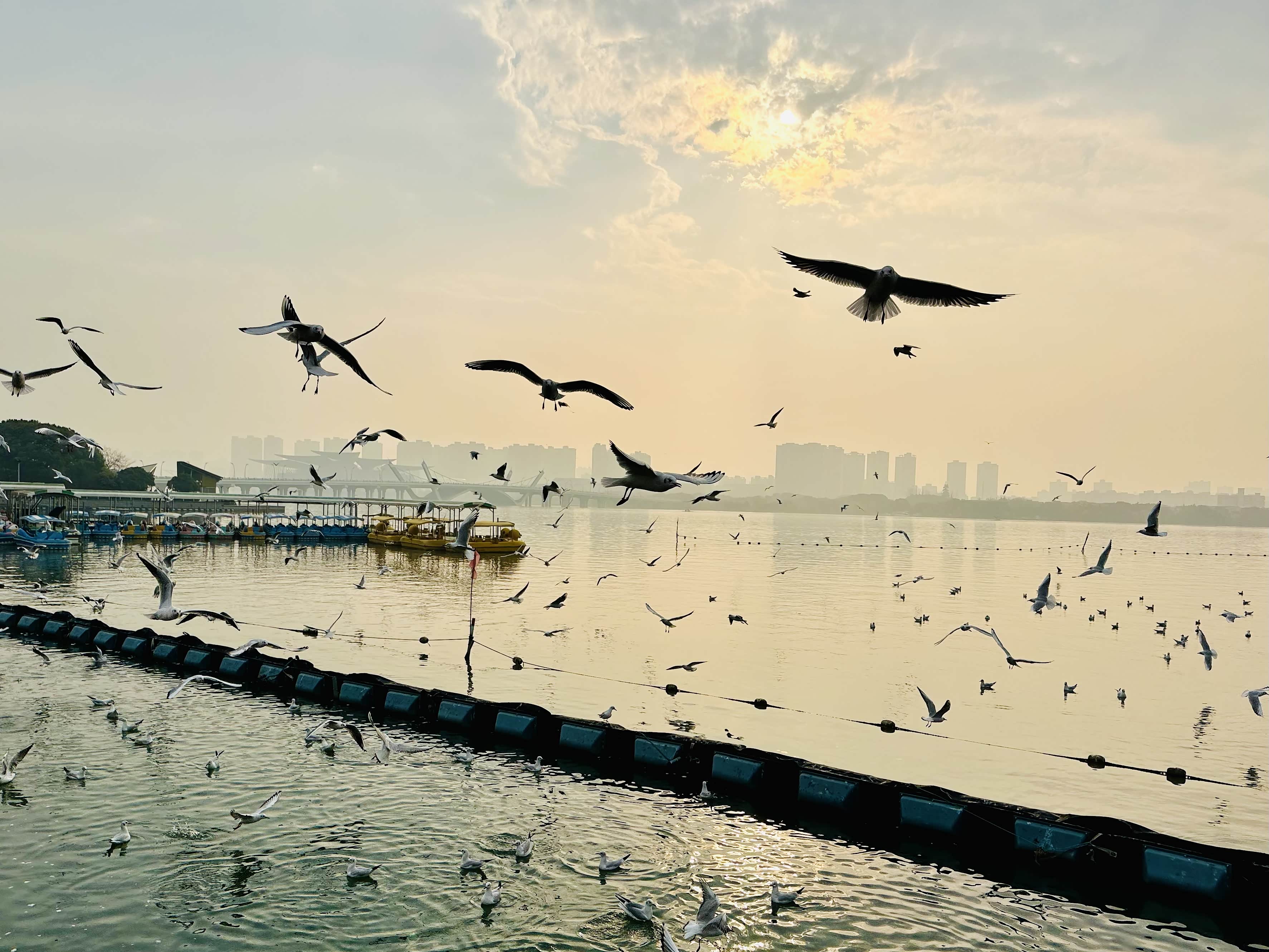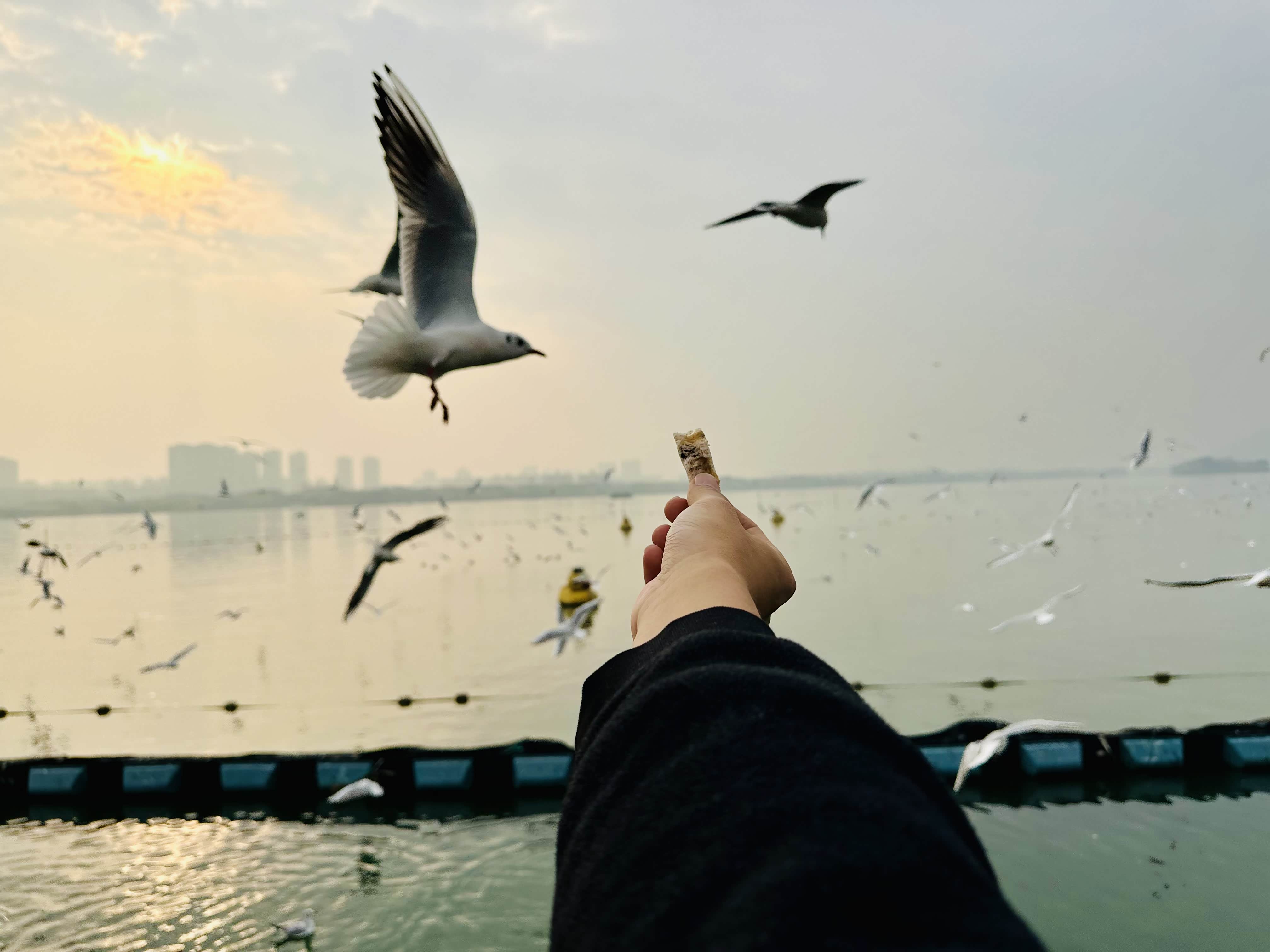 来到蠡湖边的那一刻,我和儿子都惊呆了:波光粼粼的湖面上,满眼都是红嘴鸥的身影。它们成群结队地或在湖面盘旋,或在水面掠过,振翅的声音混着清脆的鸣叫,汇成了一场生动的自然交响曲。而随着游客们纷纷开始投喂,红嘴鸥群更是直接飞到了人群之中。这壮观的景象,让冬日的蠡湖也多了几分鲜活的气息。