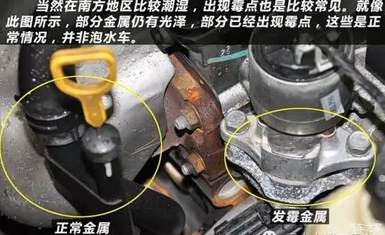 1.金属有无霉点和锈蚀,有霉点说明受过潮,但不一定是水泡,长期空气潮湿也会产生霉点。同理,锈蚀也一样,但碰撞修复后锈蚀会出现得比较多一些。