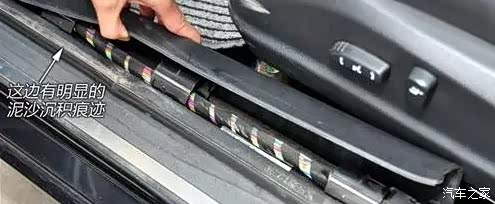3.门框胶条、地板、门槛护板内、车内线束接口,看门框胶条缝隙有无泥沙、看地板地毯有无变硬、起球(刷洗后都会有的痕迹,不一定水泡),门槛护板内有无泥沙痕迹,车内线束接口有无霉变。