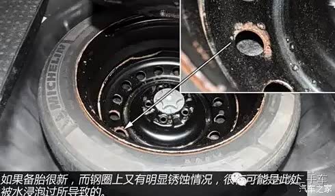 3.备胎,看备胎花纹里是否有泥沙或轮毂是否锈蚀。