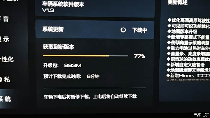 再说说升级过程。启动车辆后,一般安装包就自动下载了,总共883MB,下载速度跟网络有关,我车在地上停车场,整个下载过程大约20多分钟,耐心等待就行。