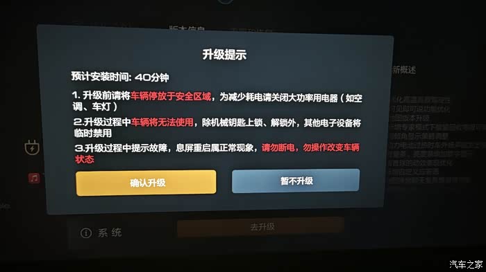 先讲讲升级前的准备工作。官方建议升级车辆电量 30% 以上,但还是建议大家电量更多一些更保险,要是冬季很冷的地区升级中途没电,就比较麻烦了。另外建议找个信号好、安全的地方停车,像地下车库信号差,会影响安装包下载速度。