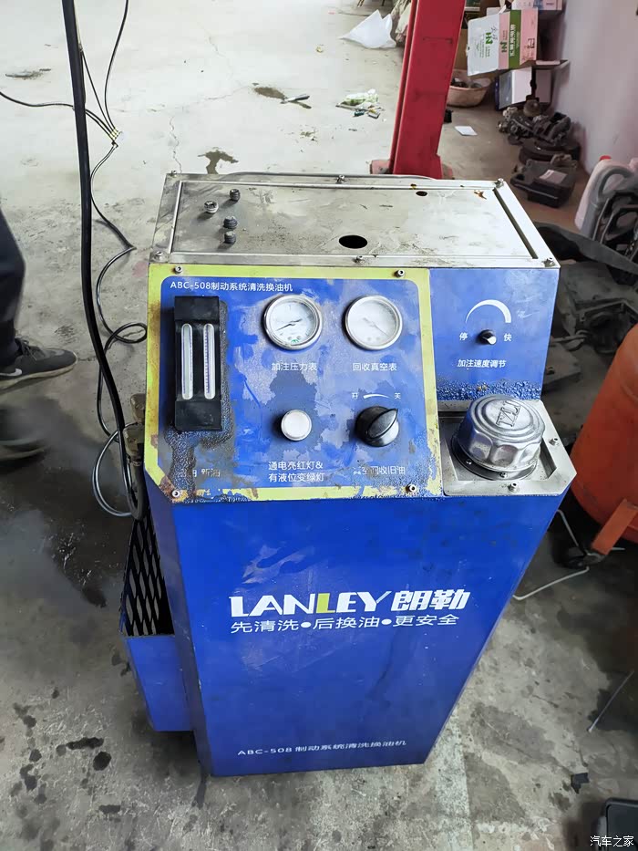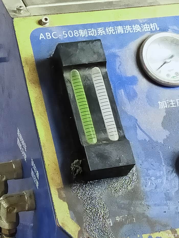 左边的有点绿色的是目前汽车里的刹车油,右边是清洗剂,需要把老的刹车油清洗置换出来。然后把新的刹车油换进去。