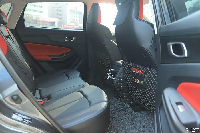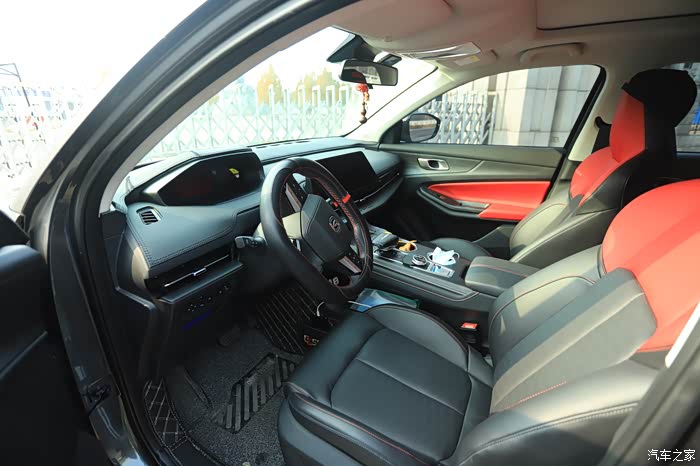 双色真皮座椅红线缝制,腰部支撑感觉非常舒适