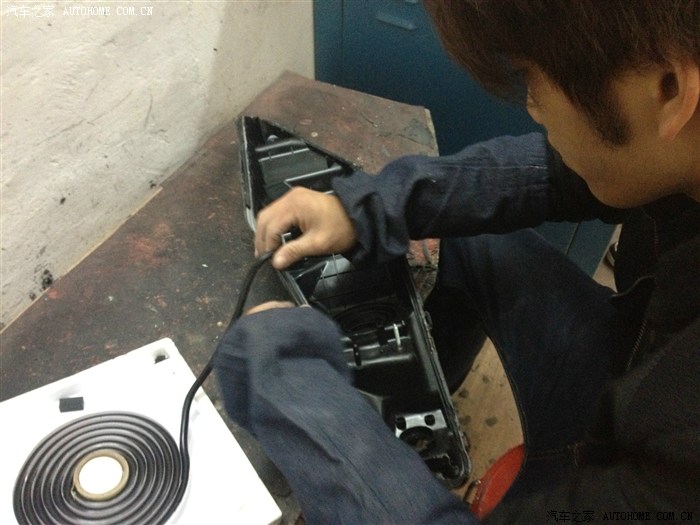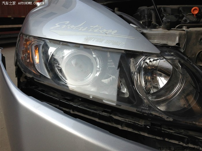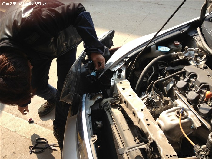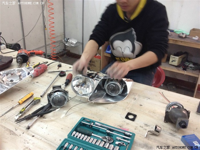 我跟老板约了一个星期天 呵呵 那天还正好是元宵节 我早上9点半赶到店里 老板是一个挺年轻的小伙子 跟我同岁 老实说 我对他的技术还是有点怀疑的 但看了他很多的杰作 也算放心了 之前我就跟老板商量好了配置和价钱 国产Q5透镜(车友们 市面上Q5的拆车件可不容易找的哦)之前有想过海拉3 第一太贵 第二 海拉远光出名 Q5近光略胜一筹 欧司朗4300K的氙气灯(这个色温穿透力强) 松下安定器(天籁上得拆车件,后来尝试效果的确好 启动贼快 基本是瞬间启动 频闪起来也很爽) 送白色天使眼(这个我伤透心了 后面详谈)红色恶魔眼 好了 废话不多说 上图啦