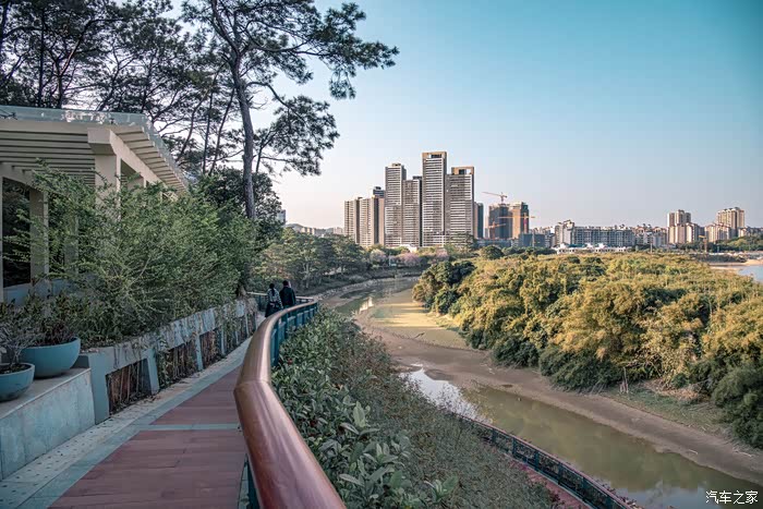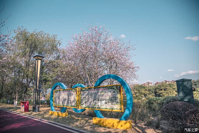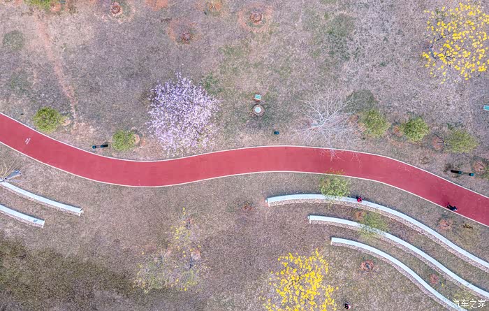 公园市处呈现出S型的绿道结合黄花风铃木,宫粉紫荆勾勒出极简的画卷