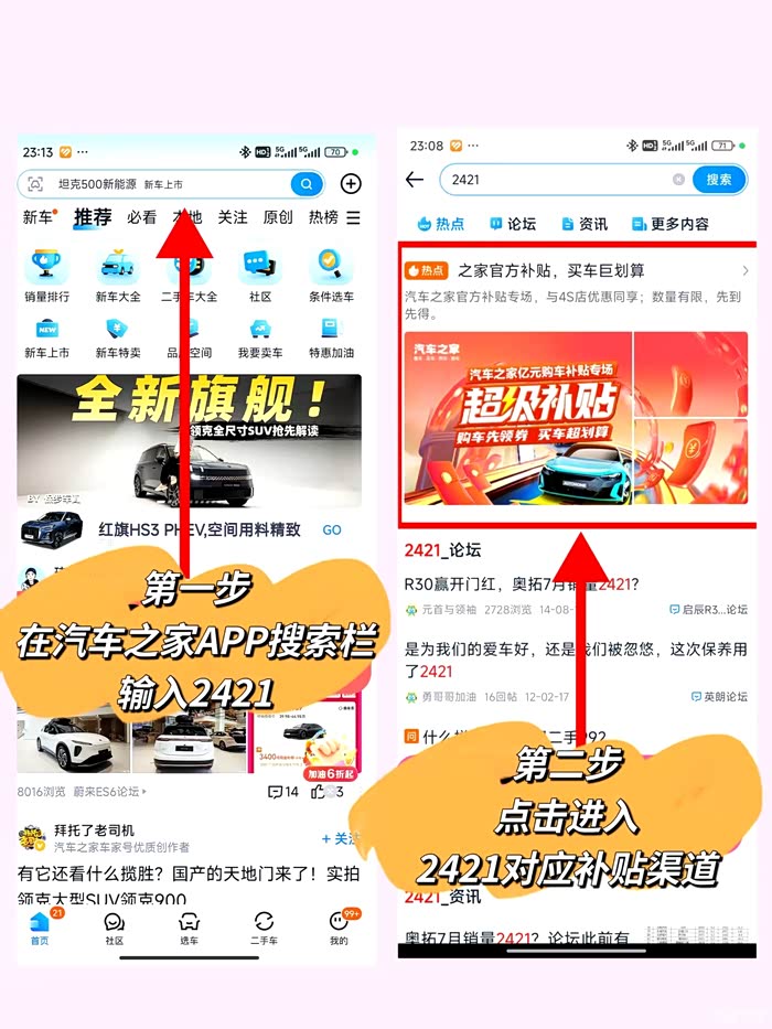 2. 方法二:打开手机的汽车之家APP,搜索2421,找到“超级补贴活动”进入,在搜索框输入想要购买的车型,对应完成领取。