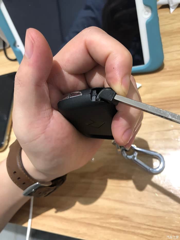 按住食指银色那个按钮,按到底,轻轻一扣备用钥匙就拿出来了!