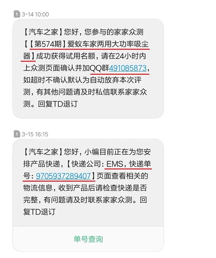 获得测试机会后我们的手机,就是当初申请测试机会时填写的手机号码,会收到一条确认测试的短信,短信内容需要特别注意三点,一:获得的测试产品名称和所属的期数。二:24小时内到APP或PC端众测页面进行确认,回复短信是没有用的。三:家家众测QQ群的号码,申请入群。