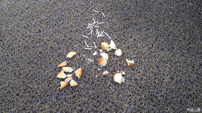 粉碎完了以后,对于车里来说是常见的垃圾,也是最头疼的垃圾。。。只有吸力强大的才能把它们从丝圈脚垫里吸出来,吸取成功。。。