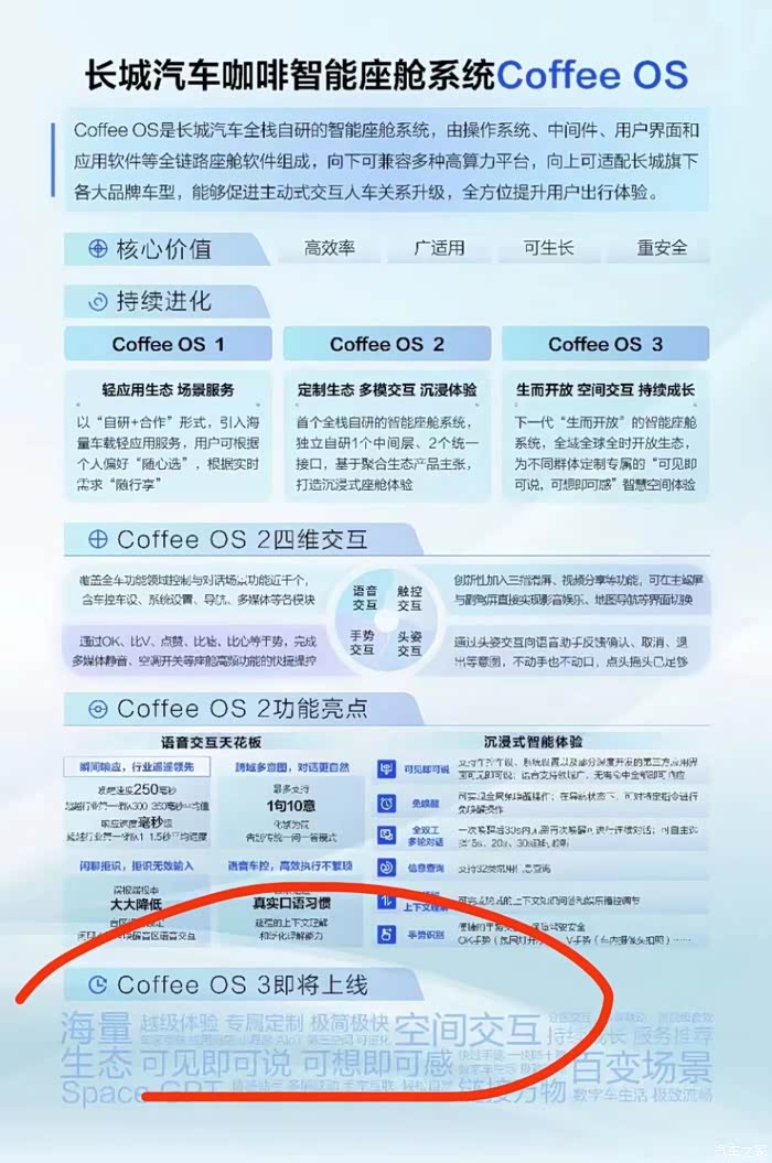 出色的硬件也要有强大的软件搭配。长城自研的Coffee OS就是这样一套完善的软硬件结合的系统。一路上的持续进化,精心设计的四维交互和数不胜数的功能亮点都让他成为目前国产市场中的一颗明星,接下来的Coffee OS3肯定也会更加出色,大家敬请期待。