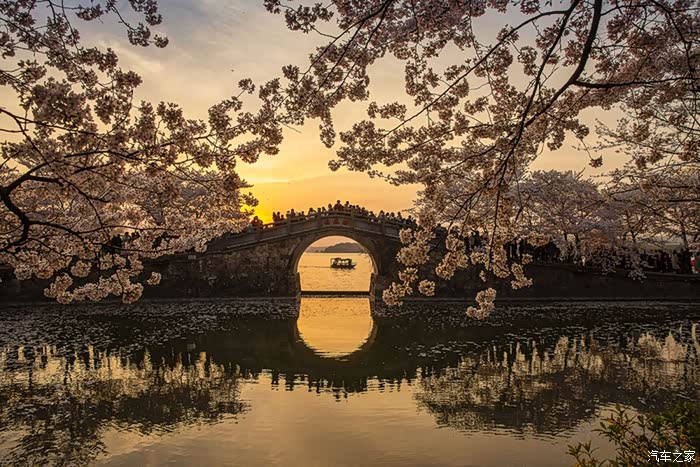 在观赏了樱花谷和赏樱阁处的樱花后,我便在长春桥对面的位置”扎下营”来,将镜头对准长春桥准备拍摄“日照金洞”的经典瞬间。因为拍摄这个景点的人很多,只有早点占位。这样从中午一直等到傍晚,功夫不负有心人,终于拍到了一张长春桥“樱花映晚霞”的片子。
