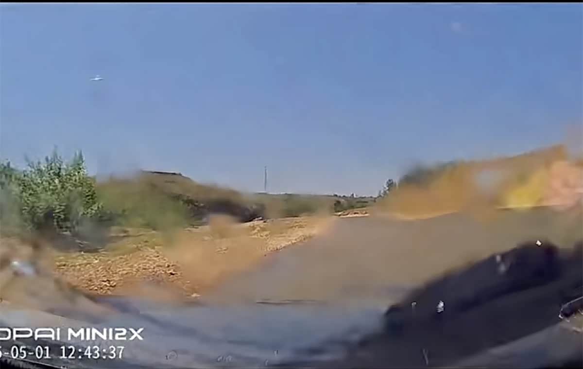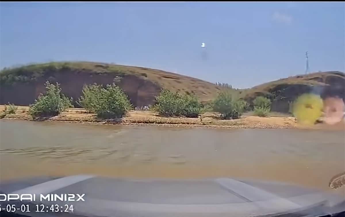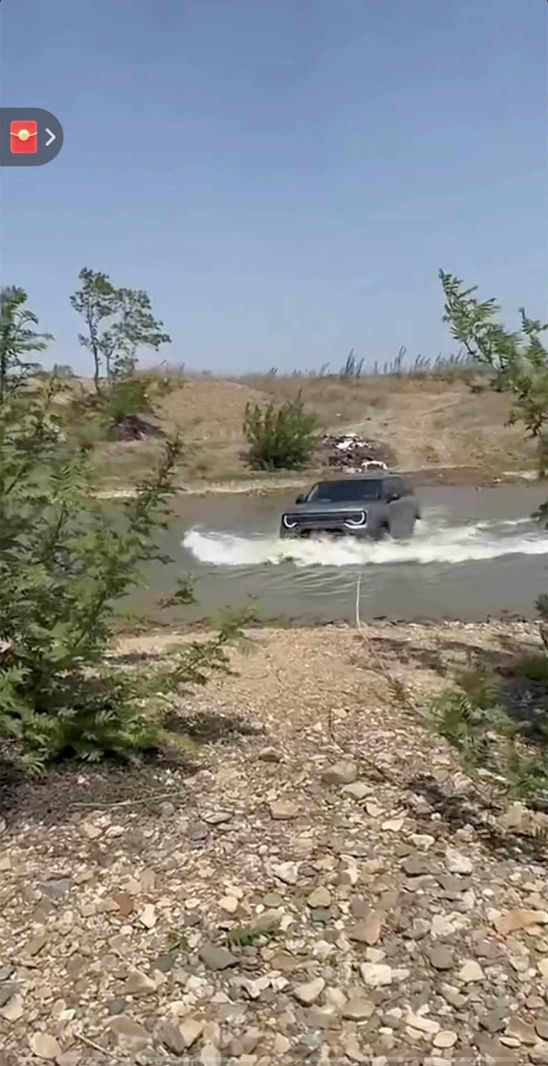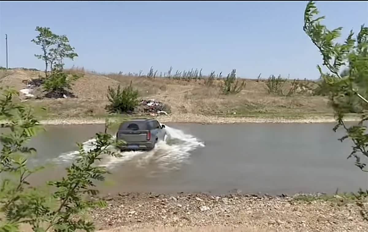 这是车内视角,可以看到这个下水的向下倾斜度,前轮进水的时候水位基本上快到引擎盖了。