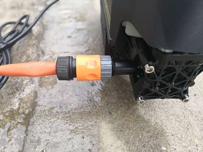 1,进水口和出水口到枪柄全部采用螺丝旋钮,安装使用便利性太差。这次洗好车,尴尬的一幕发生了,出水口扭不下来,洗车后本来手比较滑,后来我们两个人用毛巾包起来,各种蛮力 才把高压水管旋下来。 而朋友的洗车机接口全部采用卡式结构,插进去就可以使用。拔出来也很便捷。