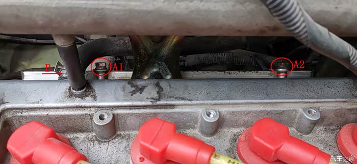 拧下A1、A2两颗固定油轨的螺栓,为了取出油轨方便起见,拔掉B处的这个管子。