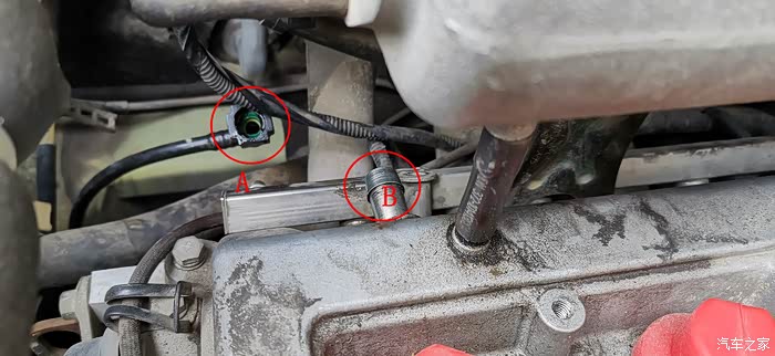拔下A处油管卡口,此卡口两侧有两个卡扣,捏紧卡扣就能拔出来。B处的那根管子也已拔掉。