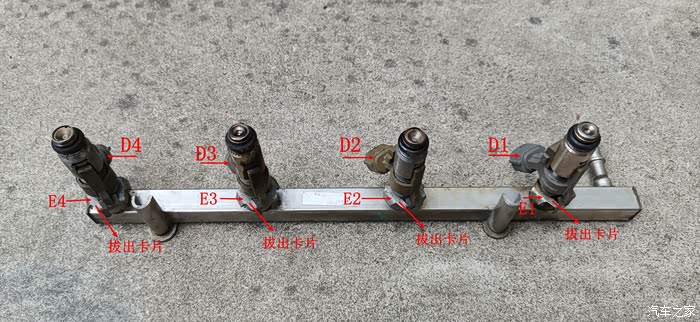 从油轨上拔出喷油嘴之前很得拔出每个喷油嘴上的固定卡片(E1、E2、E3、E4),按图示箭标所示方向取下固定片,然后用力拔出喷油嘴。