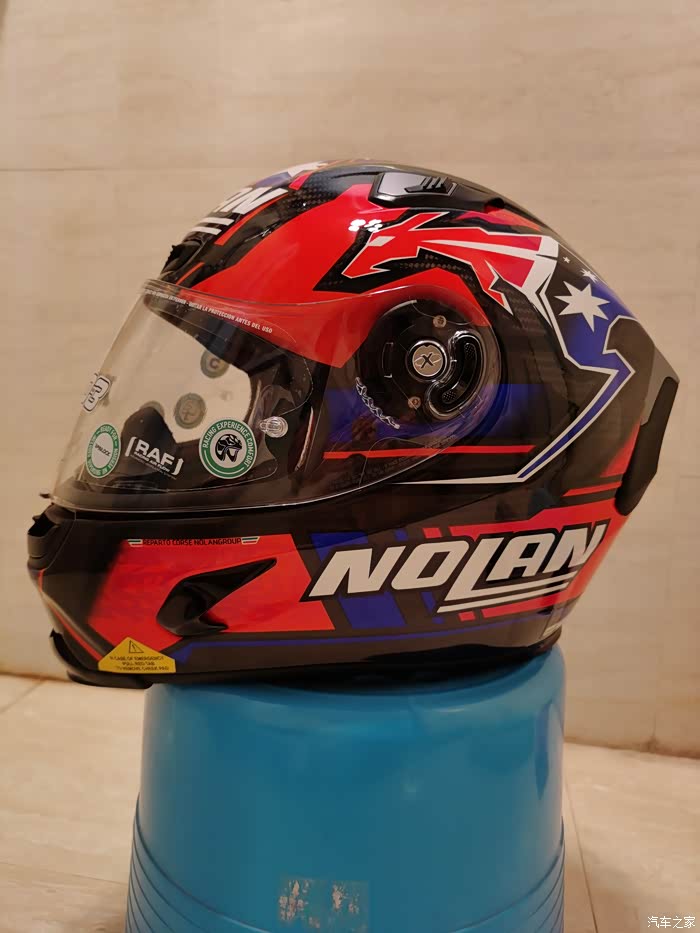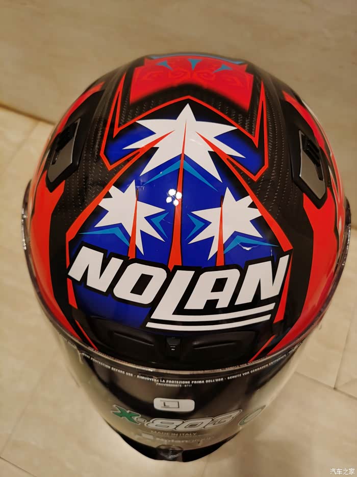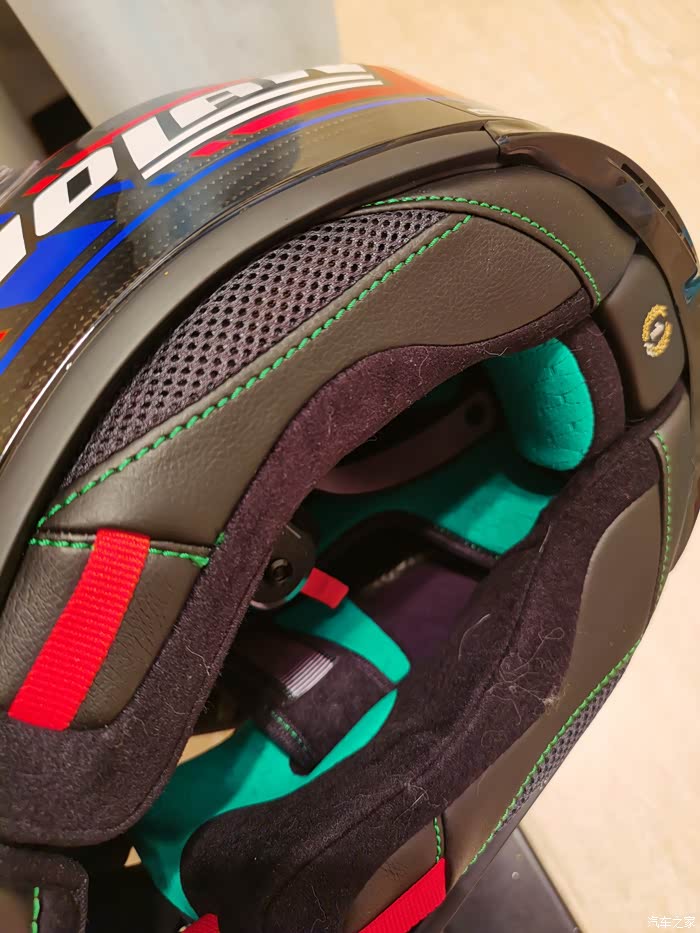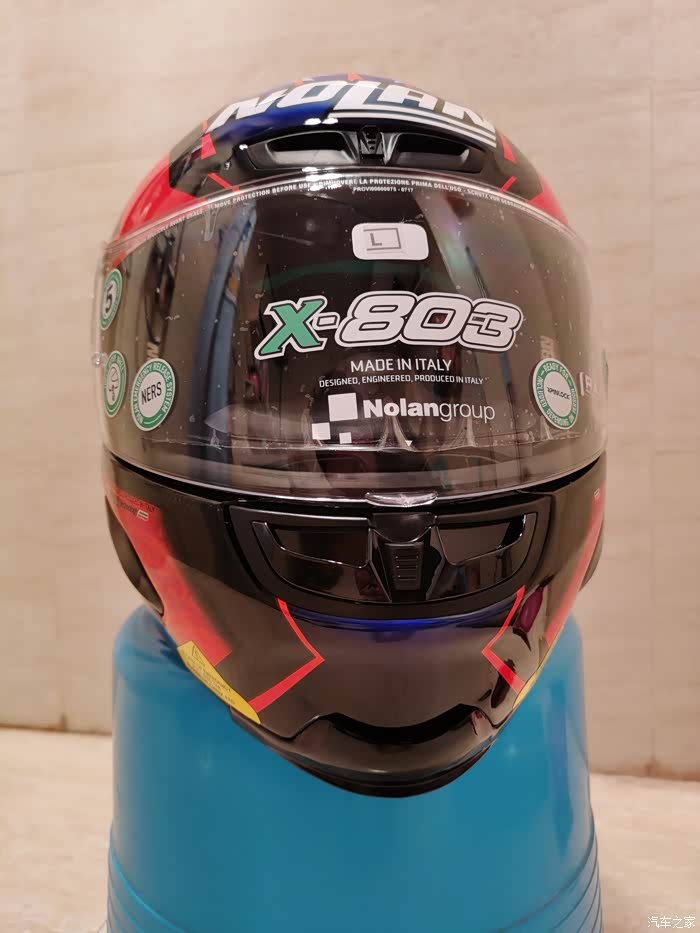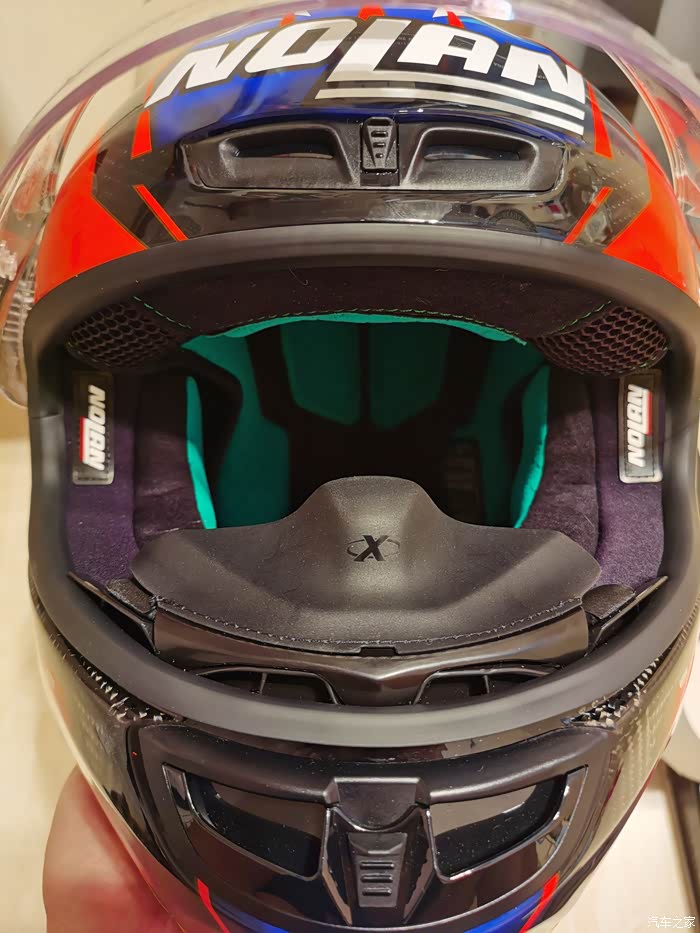 ),最终选了个斯通纳版画的803,三千多大洋,性价比来说很高了。nolan的盔以前买过,我56.5-57的头围L码正合适(shoei和ogk的是M码,一般是欧洲盔要选大一码)。下面说说试戴的感受,戴上803最直接的感受就是紧,或者说是包裹感非常强,但是不夹头不夹脸,非常舒服,而且看内衬材质透气性应该不错,个人感觉佩戴舒适度是胜过shoei Z7的,这里有个问题就是戴眼镜比较麻烦,得调整很多次,当然调整好之后眼镜是一点不会松动,不像空气刀5会滑出来经常得扶一下。另外803的鼻封很大,基本能覆盖整个鼻子,对防止眼镜起雾应该有些作用。至于通风性和风噪,还没戴着骑过车,想来应该不会差,毕竟是赛盔。最后说一下重量,L码的803是1380克,M码的Z7是1500克,M码的空气刀5是1430克。下面附上照片大家看看吧,争取明年买个RX7X再来作对比