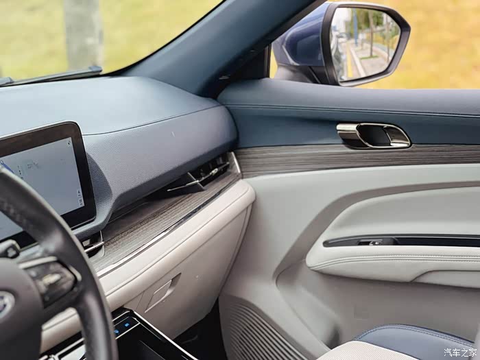 内饰不仅有很多软包,还加入了不少木纹装饰,蓝白色的搭配让车内氛围感很温馨。