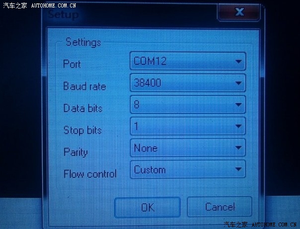5、点击Com端口,出现如下图,按图中设定后点ok。注意图中port为你电脑连接obd scan 的实际端口,本例为com 12。