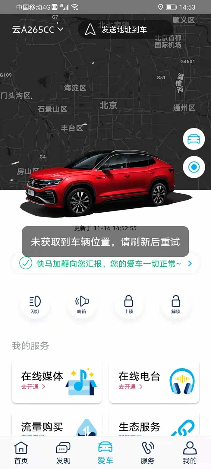 2020年9月30日花26w提车,探岳X两驱尊贵智联版,车联网功能(一汽大众已授权认证)车辆行驶数据无法传输到手机,手机一汽大众APP 也无法获取任何车辆信息和控制车。(4s店极不负责说是大众车联网技术还不成熟,后台服务器访问量大,没办法,一拖再拖不解决)请问车友么的探岳X有同样的问题吗?谢谢!