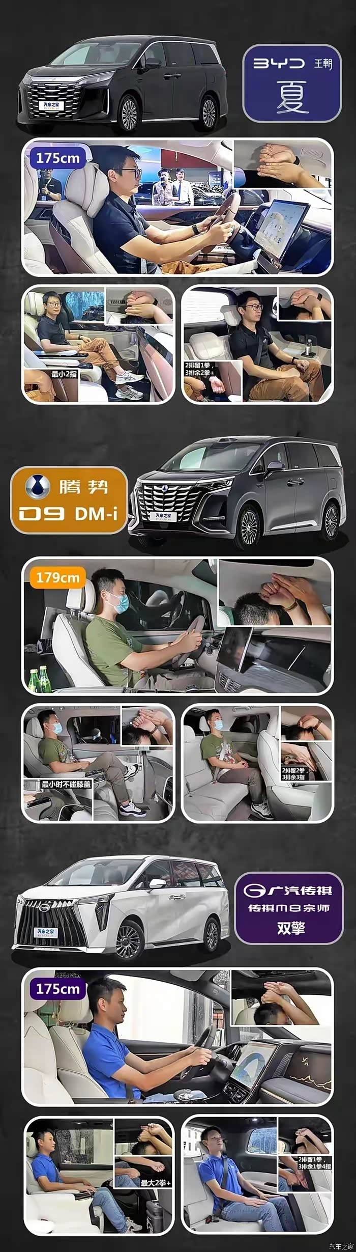 三台车的定位都是中大型MPV,比亚迪夏更加亲民。能源形式上,三台车有所区别,比亚迪夏是全系1.5T插电混动;腾势D9则是1.5T插电混动和纯电都有(本文我们以DM-i插电混动来做展示);传祺M8是2.0T的油电混动,通俗点儿说就是不可充电,需挂蓝牌,当然传祺M8也有插电混动版,只是名字叫做传祺E9。