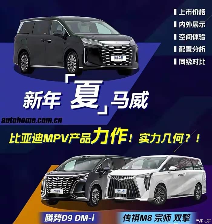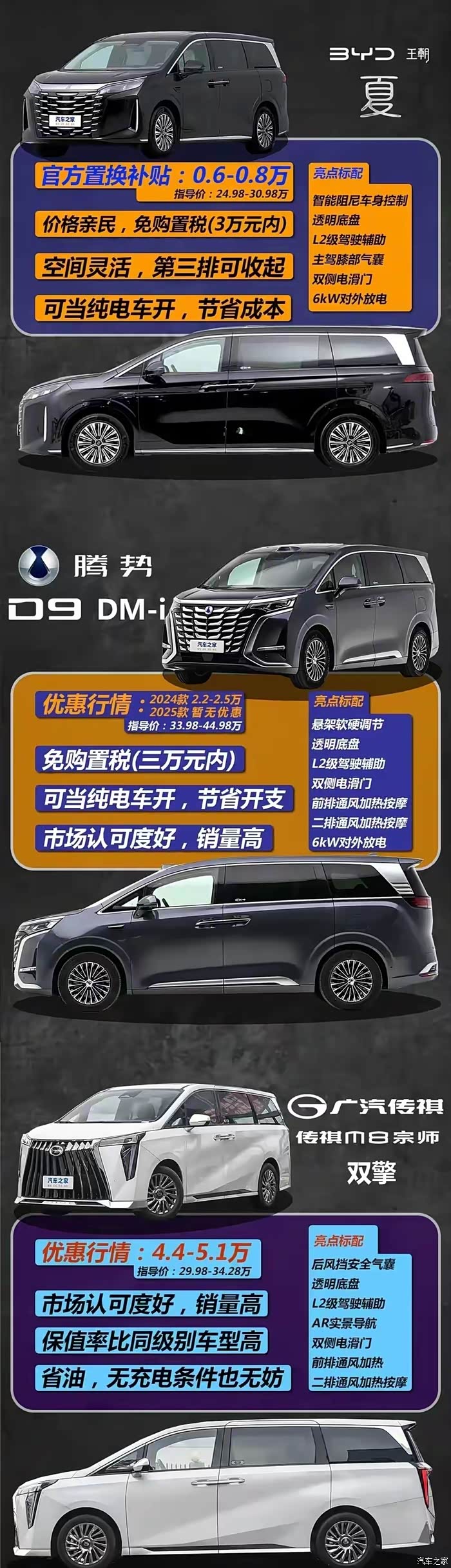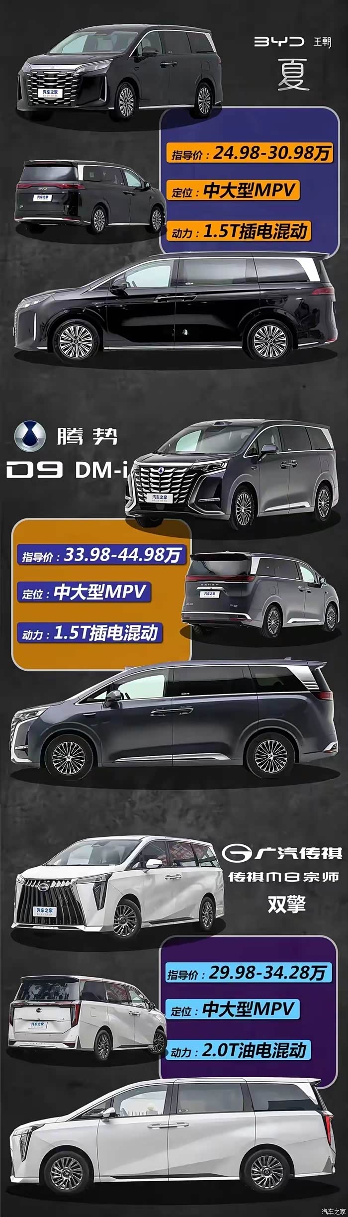 目前市面上的MPV产品还是非常丰富的,接下来我们挑选近半年来累计销量最高的两款中国品牌MPV产品,腾势D9和传祺M8,分别卖了50000和33976台,让它俩和比亚迪夏做个全方位对比,看看比亚迪夏的实力几何。