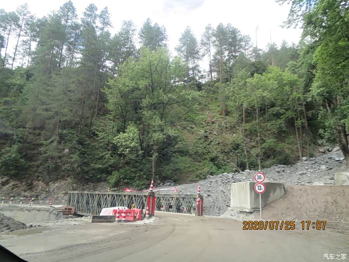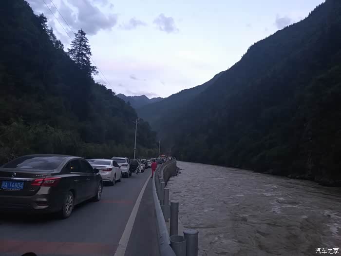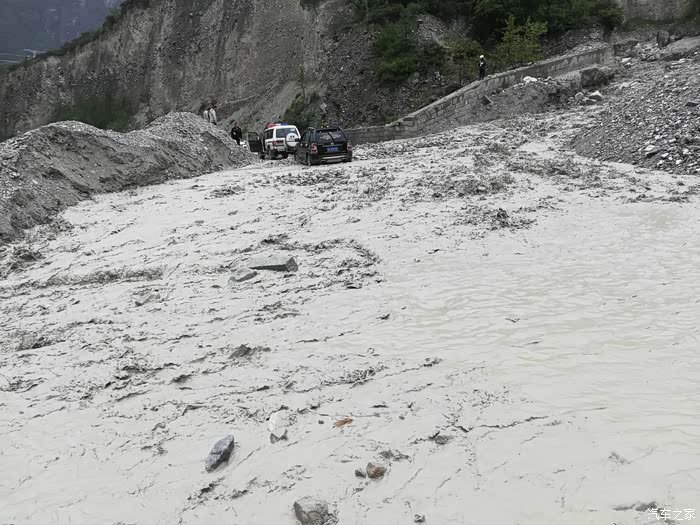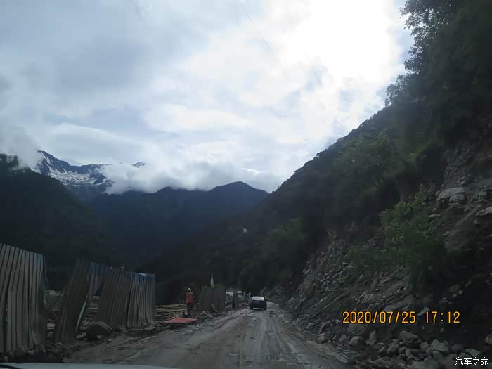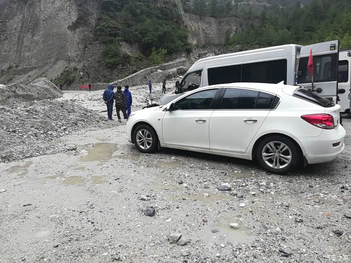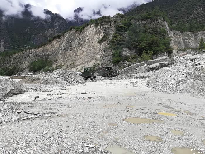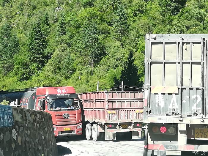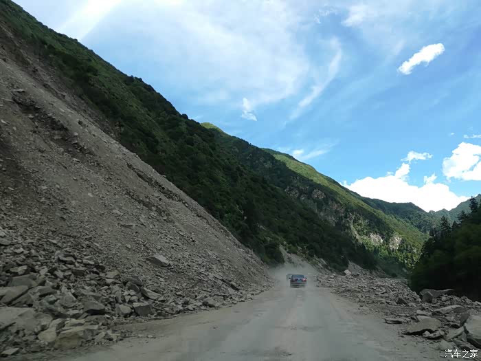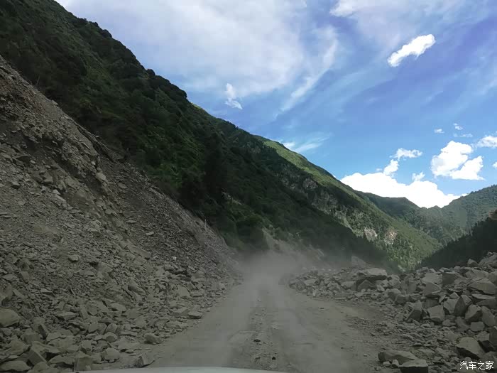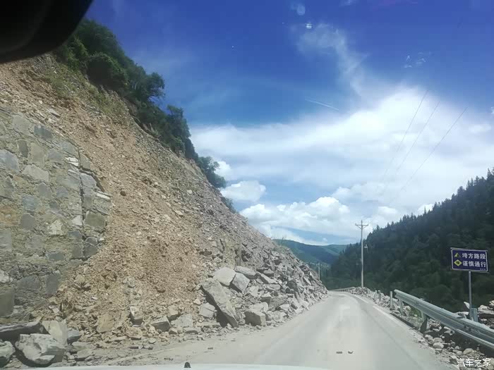 第二天估摸前面塌方能抢修好通车,决定沿317国道继续往成都方向走。走到昨天第二次堵车的地方,等了约半小时,看到一辆辆的车不断往回走,以为是通车了,一问,结果是在前面昨晚睡在车上,等了一晚的车纷纷掉头,原来是前面的塌方,一面抢修,一面不断有落石滚下,短时间难通车,今天都有可能通行不了。