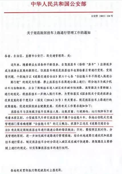 2016年11月7日,国家旅游局、国家发展改革委、工业和信息化部、公安部、财政部、国土资源部、环境保护部、住房城乡建设部、交通运输部、国家工商总局、国家体育总局以旅发〔2016〕148号印发《关于促进自驾车旅居车旅游发展的若干意见》第五章提到“安装符合国家标准牵引装置的小型客车,可以拖挂重量不超过2.5吨的中置轴旅居挂车上路行驶。研究改进旅居车驾驶证管理制度”
