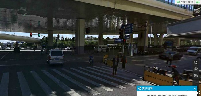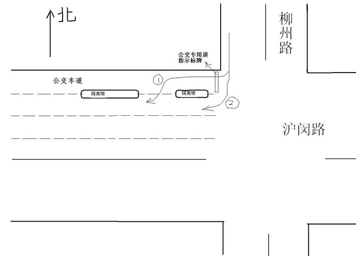 沪闵路右侧第一根是公交道,路口上方确有公交专用道指示牌,但是地上的黄色公交道在路口以后五米才标明。