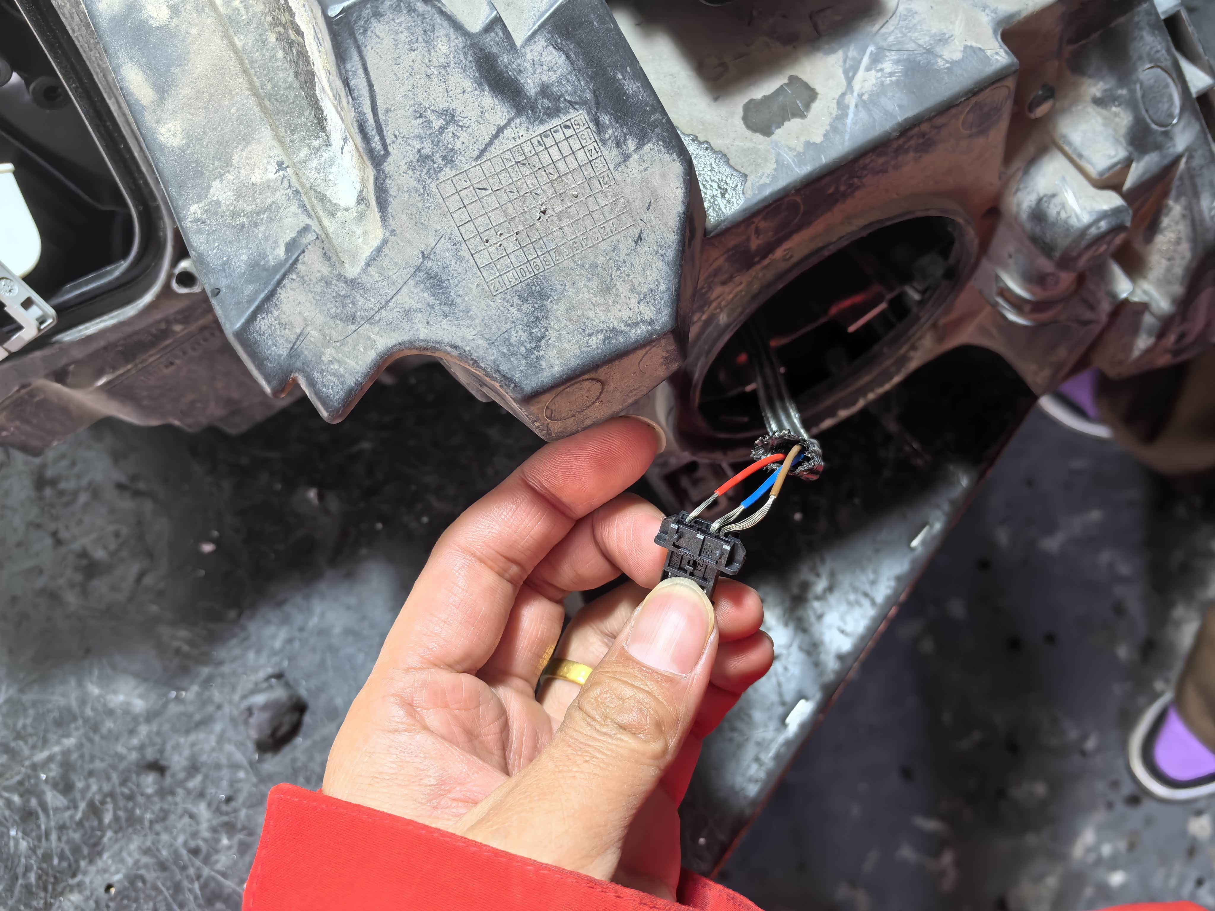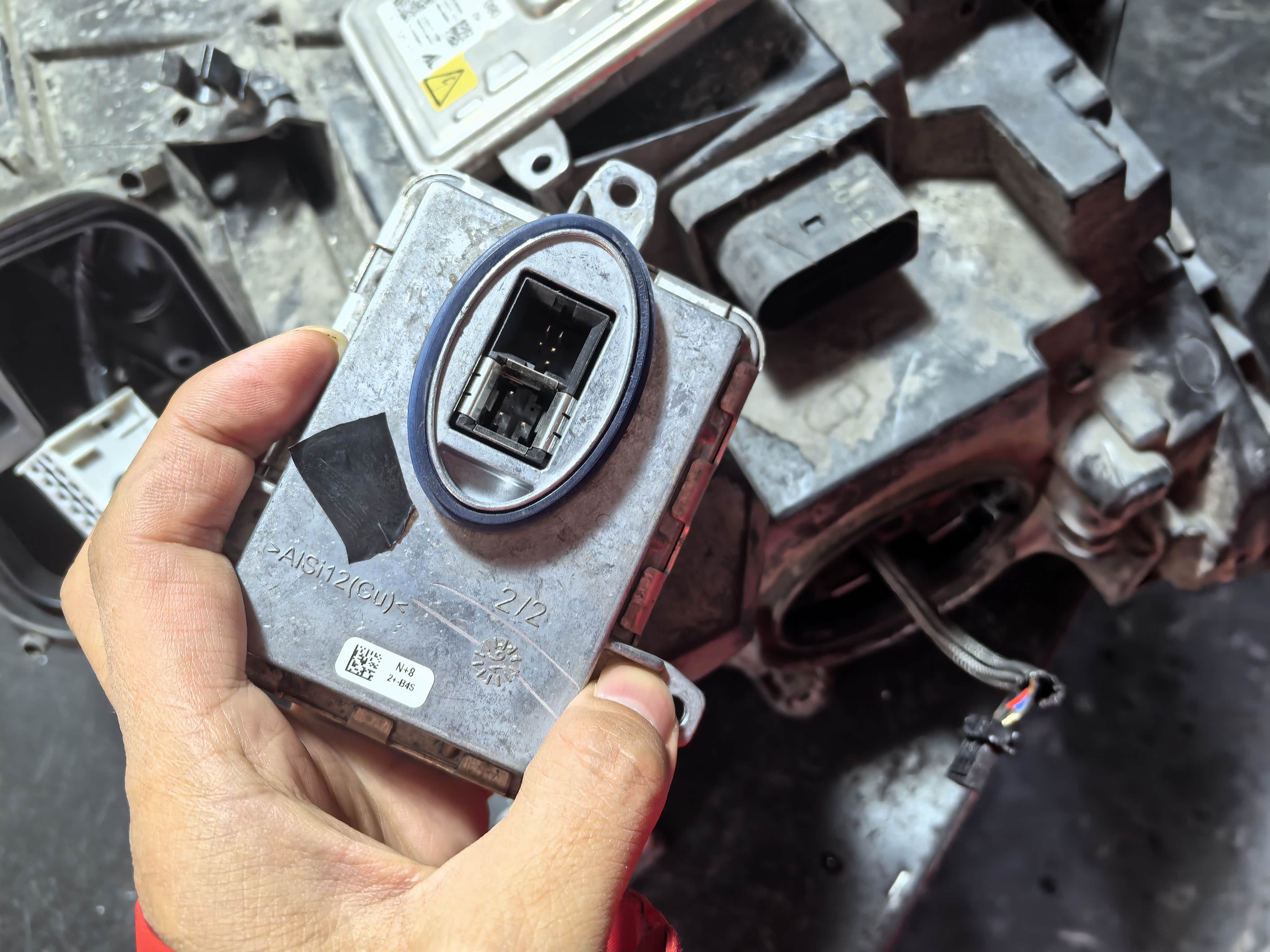 拆前杠、拆大灯,打包送到专业改灯店找改灯大神做终极检测。一开始大神还是判定驱动板烧毁,然后深入检测线路,真相浮出水面:当初装灯师傅那用力一扯,直接把三根电线从插接件里硬扯了出来,线路短路,才导致驱动板接二连三被烧!