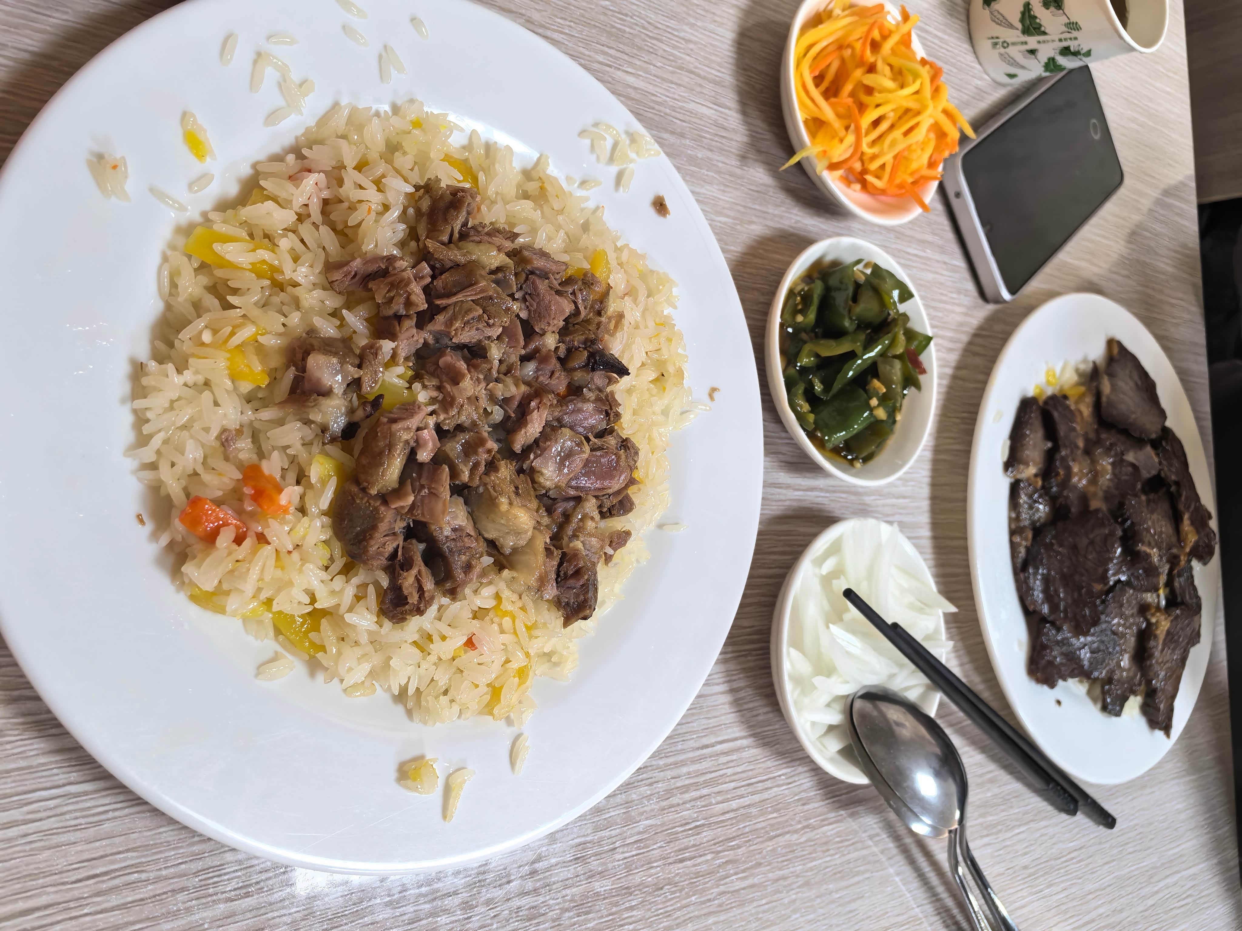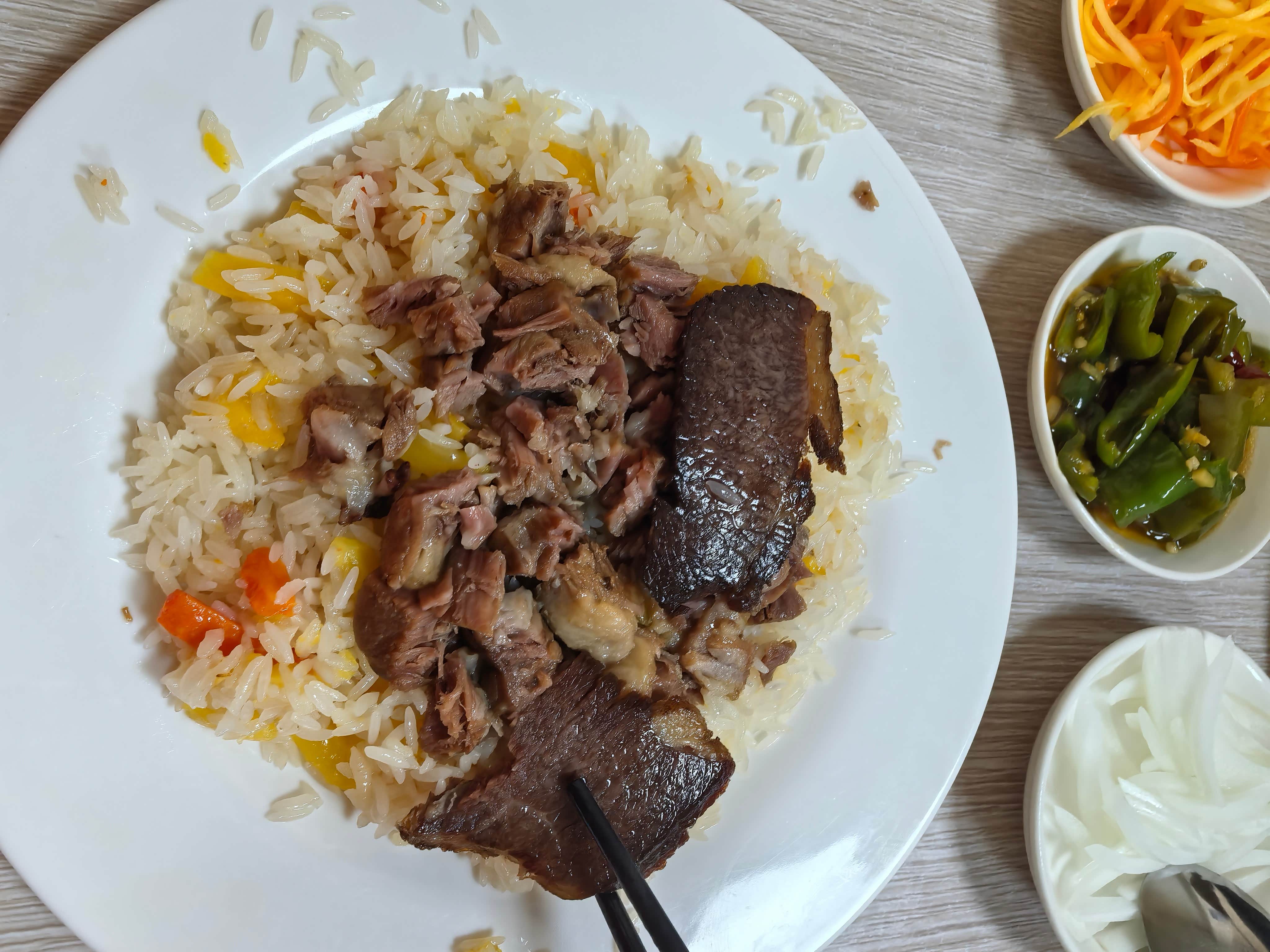 碎肉抓饭、风干肉抓饭,两人一人一个吃!