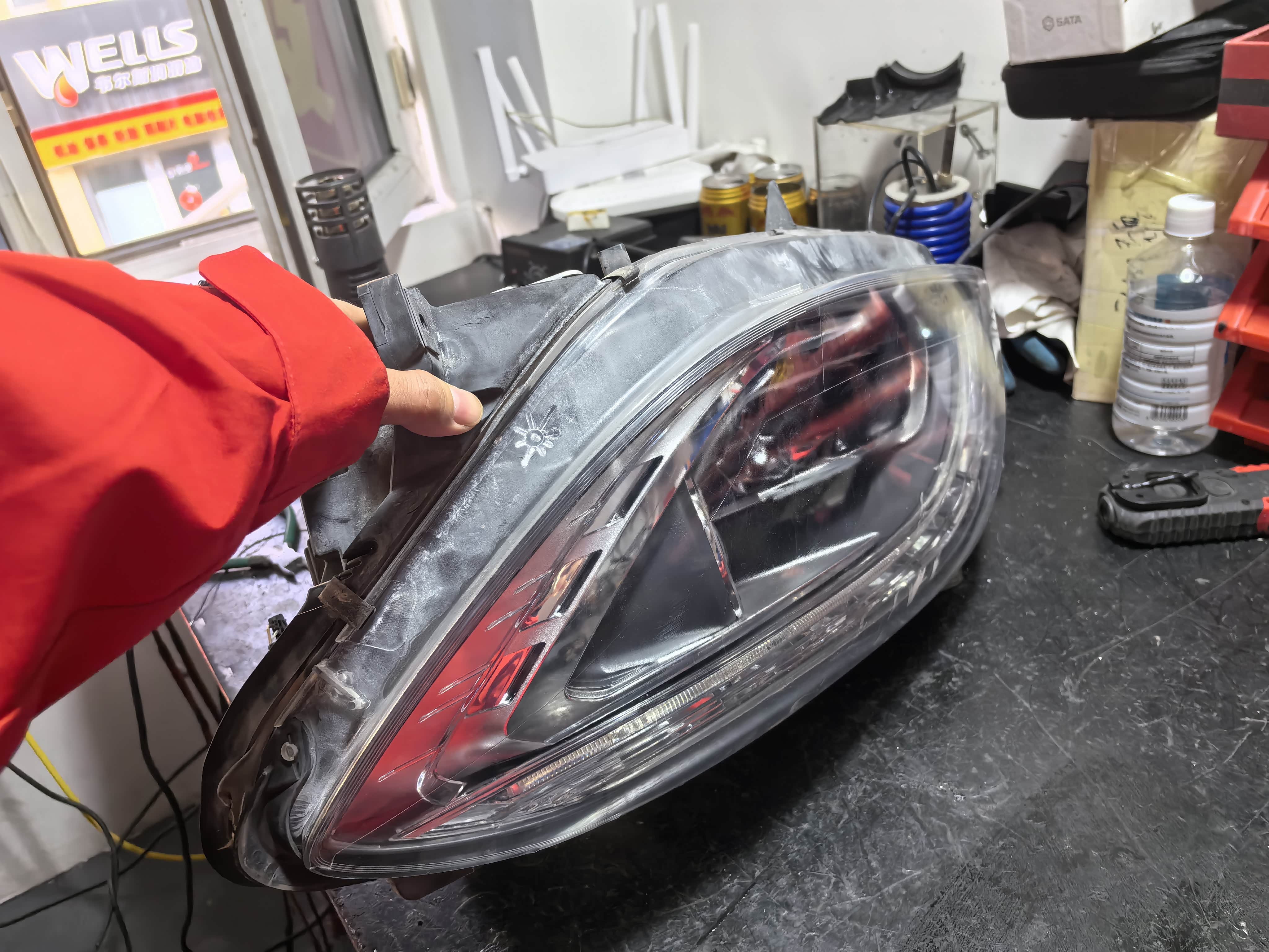 轮毂轮胎换完,灯罩抛光完毕,修车大神开始动手换灯泡,也不知道是不是大神经验不足还是大神修奔驰少,灯插头死活插不上,记住接下来的操作:大神使劲扯了扯线。