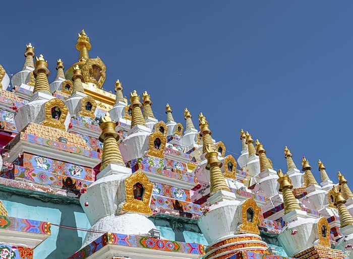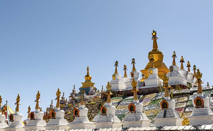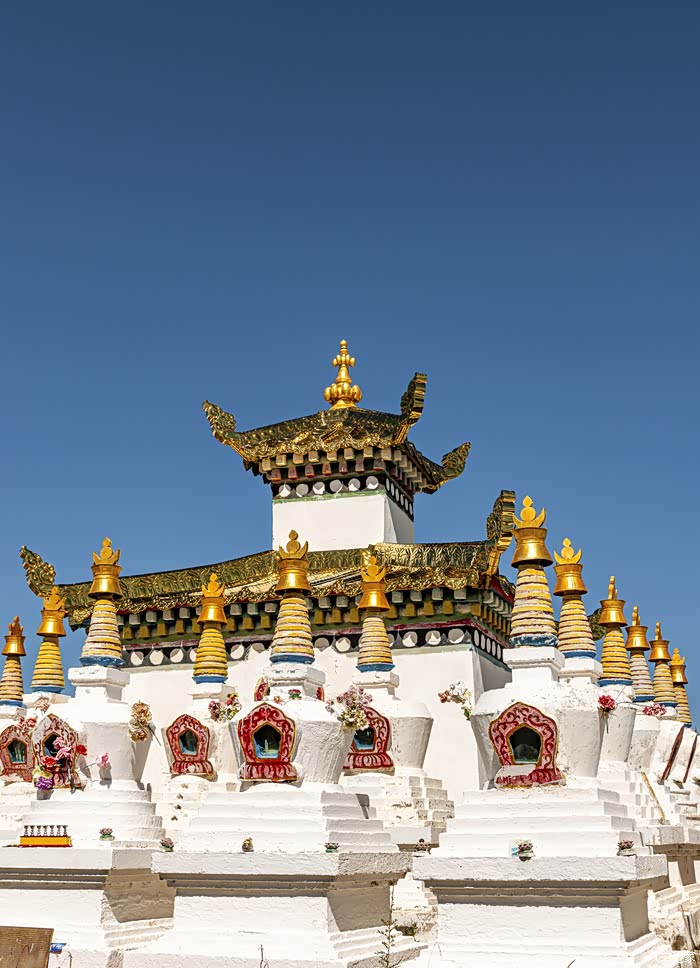 瓦切塔林的入口处,金字塔形的主塔由许多华丽的小塔组成。它们涵盖了八种藏式宝塔,代表了佛陀生活的不同阶段。