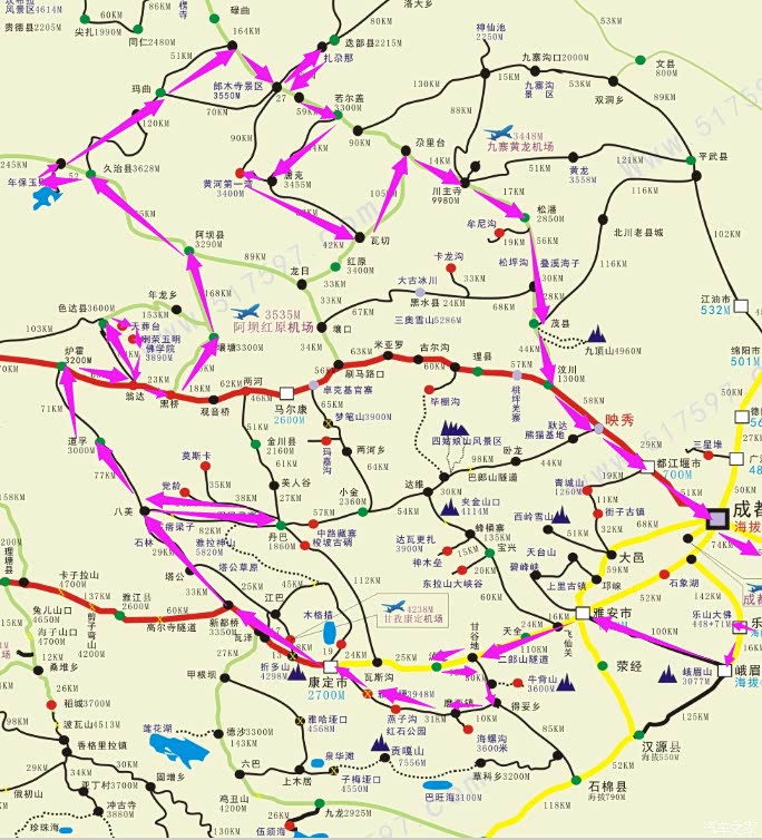 瓦切经幡群位于四川省红原县瓦切乡。它是一个丁字路口,北距黄河第一湾60公里,南距红原县40公里,东距松潘县四川主寺150公里。在藏语中,Vachetalin的意思是“大帐篷”,是纪念第十位班禅大师的地方,以祈求佛经和祝福。四周是连续不断的祈祷旗,非常壮观。