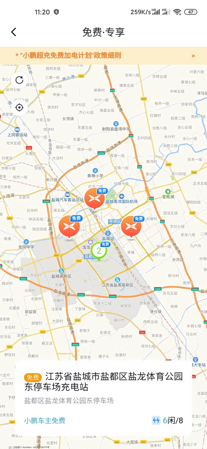 提前在小鹏app里面看好免费充电点,第一站我选择在盐城