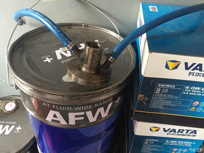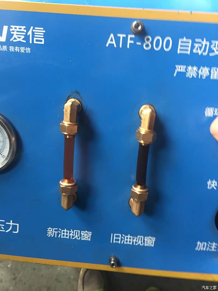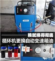 循环机换油过程中需启动车辆。此时新油被注入自动变速箱内,旧油则被压力顶出来 左边是新油 ,右边是旧油. 说明重力更换不能达到彻底更换变速箱油的目的...