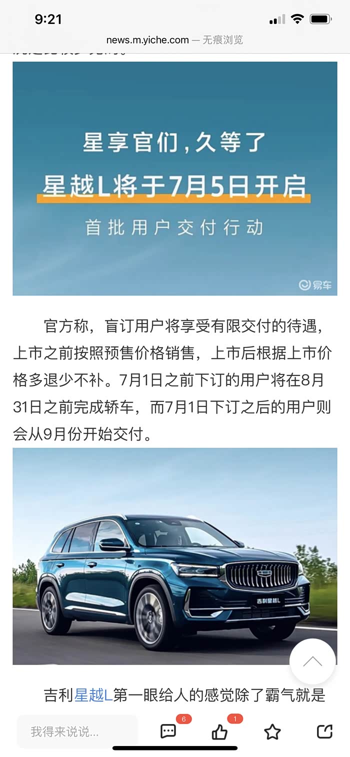 6月22日,在4S店订购了吉利星越L车辆,由于当时车辆尚末上市,车辆以盲订的形式预售。7月20日,吉利汽车在浙江上市,上市时承诺7月1日前预定了星越L车辆的用户,按照预定时间顺序,依次交付最迟于8月31日交付完毕。但至今经9月8日,厂家末能实现其承诺的7月1日前预定的用户,在8月31日前交付完毕。原吉利公众号有写交车时间,现已删除,厂家存在虛假、欺骗宣传。