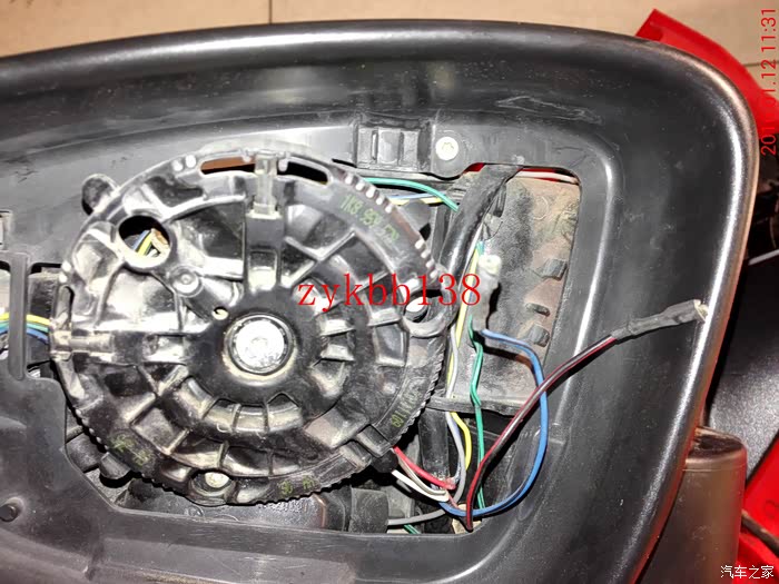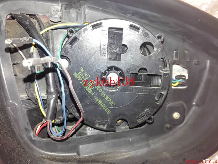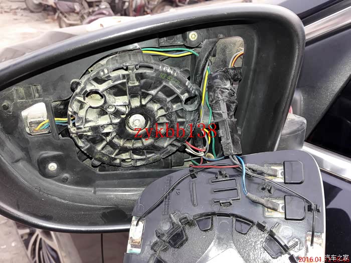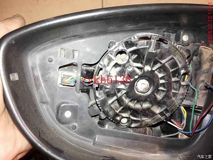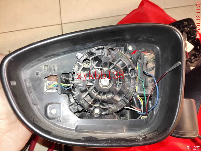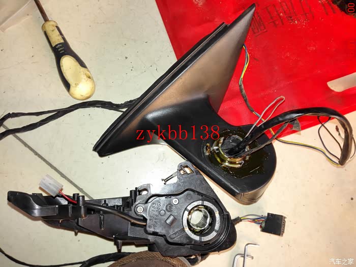 拆下镜片,可以看到里面的链接线束和下翻电机,拍照备用。其实拆后边的后视镜和左边的后视镜的步骤有点重复: